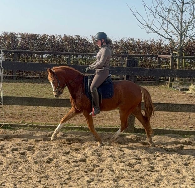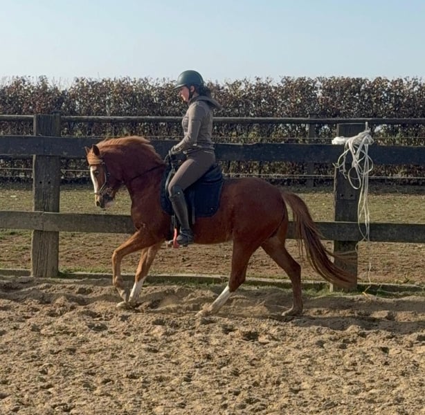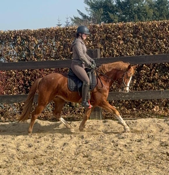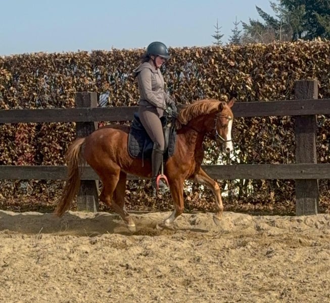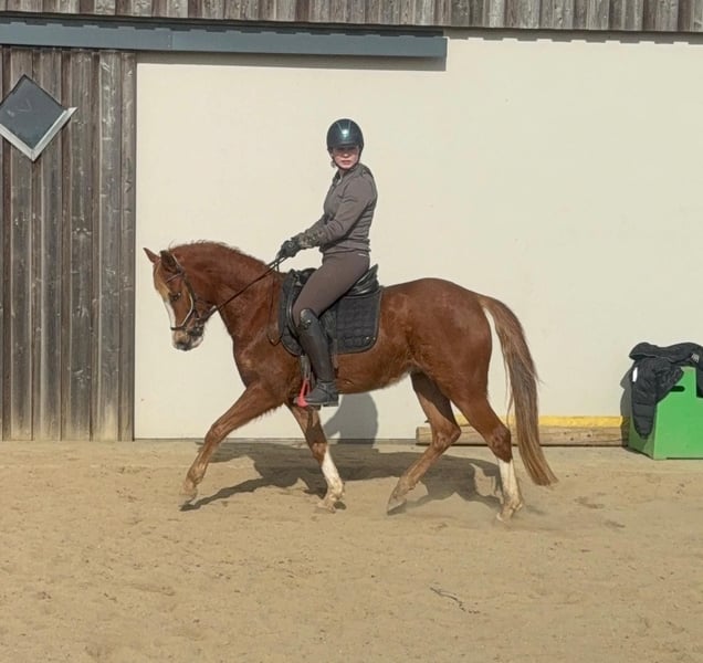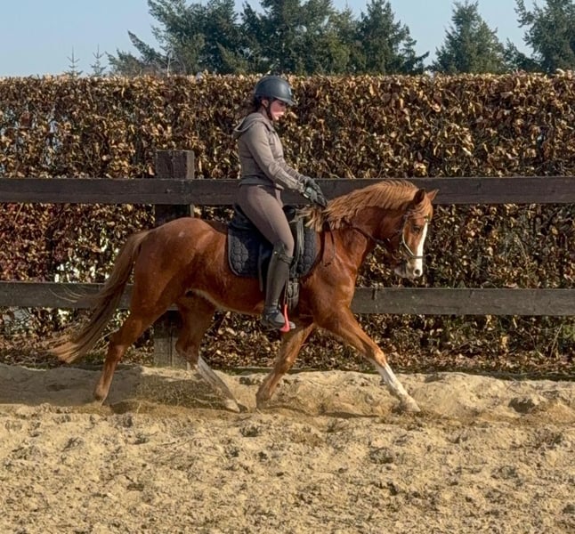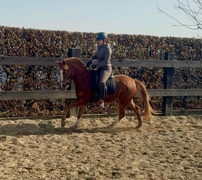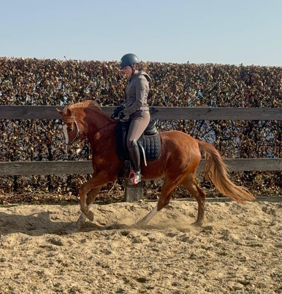 Zum Verkauf steht eine etwa 143 cm große, fast 5 Jahre alte Deutsche Reitpony Stute. Sie ist als Staatsprämienstute ausgezeichnet und zeigt gute Bewegung. Sie ist in der Dressur bis A** ausgebildet und auch schon auf Turnieren vorgestellt worden. Im Training wurde jetzt mit L angefangen. Sie springt auch gut und wurde im Training mehrfach in Parcours mit 60cm gesprungen. Dies ist natürlich noch ausbaufähig. Sie zeigt keine Unarten und ist insgesamt sehr brav mit Reiter. Man sollte trotzdem etwas reiten können. Sie lebt bei uns Im Offenstall und ist sehr verträglich. Die Box kennt sie auch. Wer ein tolles vielseitiges Pony für Sport, Freizeit oder Zucht sucht, ist bei ihr genau richtig. Krankheiten oder Allergien sind nicht bekannt. Eine AKU darf gerne gemacht werden. Für das Probereiten, Vorreiten oder anderes Ausprobieren des Pferdes berechnen wir 35€. Beim Kauf wird dies gutgeschrieben. Gerne anrufen oder eine Nachricht senden 0157 36803742 Alle Angaben ohne Gewähr, Preisänderungen vorbehalten, Transport möglich, Onlinekauf möglich