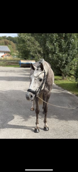Five-year-old dressage pony mare (approximately 1.44 m) with great potential For sale is a five-year-old pony mare with strong dressage aptitude and significant development potential. The mare is age-appropriate in training and demonstrates motivation, willingness to learn, and a solid basic quality under saddle. She has a good rhythm and an active hindquarters, making her suitable for versatile further training. She is a spirited, sensitive mare that requires a gentle and calm rider’s hand. In work, she already shows promising signs of connection and acceptance of the aids. In handling, she is very well-behaved, even with the farrier and veterinarian. She loads well, is registered, and measured. Recently vaccinated and had her teeth checked. Due to her age and temperament, she is not suitable for beginners—ideal for ambitious riders or for further training. A minor conformation imperfection (slightly tied at the back) is present but currently does not affect her performance. 📍 Location: 82266 💰 Price: €9,000 negotiable