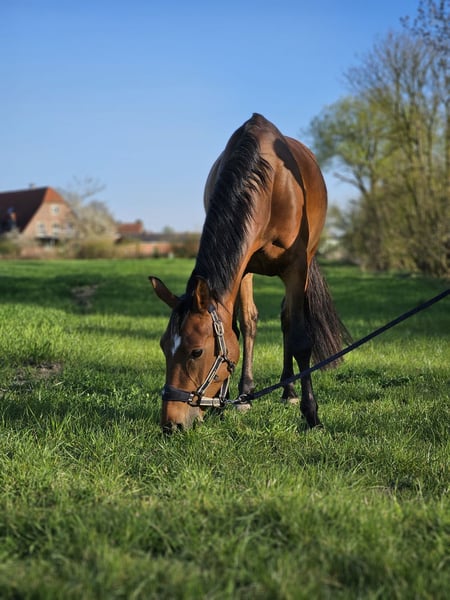 Zum Verkauf steht eine wunderschöne braune Deutsche Reitpony Stute aus April 2019. Sie hat ein Stockmaß von 144 cm und deckt auch Erwachsene gut ab. Sie wurde mit 4,5 Jahren schonend angeritten, stammt von DARK HIGHLIGHT AT x D-DAY AT ab und ist als Zuchtstute eingetragen. Ansprechende Erscheinung, freundlicher Charakter und hohe Lernbereitschaft. Sie hat ein gutes Grundtempo, ist brav im Umgang und in allen drei Gangarten gut zu reiten (mit und ohne Ausbinder) und dabei auf einem soliden A-Niveau. Auch erste Sprünge unterm Reiter hat sie bereits absolviert, dies wurde jedoch noch nicht weiter vertieft, da wir uns auf die Dressur konzentriert haben. Beim Freispringen zeigt sie viel Spaß und Potenzial. Sie hat sehr gute Hufe und ist barhuf unterwegs. Beim Hufschmied zeigt sie sich stets fromm. Aktuell wird sie von zwei jüngeren Kindern (9 und 12) sowie von einem Trainer geritten. Ideal auch für ein Eltern/Kind-Gespann mit Reiterfahrung. Sie ist kein Anfänger- oder reines Kinderpony und braucht einen erfahrenen und konsequenten Reiter, der sie weiter ausbilden und fördern kann. Im Umgang mit unsicheren Reitern zeigt sie sich manchmal etwas schreckhaft, was jedoch durch vom Reiter vermittelte Sicherheit ausgeglichen werden kann, hier braucht sie einfach noch mehr Erfahrung. Sie ist aktuell geimpft, entwurmt und besitzt einen aktuellen Pass. Sie steht momentan in Boxenhaltung, in einer gemischten Herde aus alten und jungen Ponys, wo sie sich sehr verträglich zeigt. Sie benötigt auf jeden Fall aber das ganze Jahr über Auslauf und Bewegung. Auch ein Offenstall oder Aktivstall wäre ideal. Gesundheitlich hat sie sich bei uns robust und unanfällig gezeigt, eine AKU auf eigene Kosten kann gerne von einem Tierarzt nach Wahl durchgeführt werden. Eventuell kommt auch eine Zurverfügungstellung (bei voller Kostenübernahme) in einen näheren Umkreis für uns in Frage. Für weitere Informationen oder einen Besichtigungstermin stehe ich Ihnen gerne zur Verfügung, bitte kontaktieren Sie mich per Mail, gerne rufe ich auch zurück. Videos können gerne auf Anfrage zugesendet werden. Melden Sie sich gerne bei Interesse!
