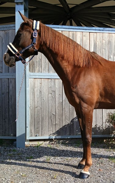 Mickey Mouse aka "Mausi" is an exceptionally loving and talented 4-year-old mare who is ready to give her heart to a new owner! This beautiful, correctly built mare not only impresses with her looks, but also with her wonderful character. She seeks contact with people and is always friendly and well-behaved. Whether farrier or loading - she masters it all with calmness and composure. She is confident, curious and courageous in the field - whether alone or in a group. Should she ever become unsure, she immediately takes her cue from her human and always remains cooperative. Her eagerness to learn and her great potential make her the perfect partner for an ambitious leisure rider who enjoys training her further. She could also present herself well at competitions in the future. This cuddly mare is the ideal companion for someone who wants to grow together with her. She is easy to handle and a real sweetheart - ready for new adventures!