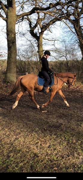 Delia is 6 years old, a German Riding Pony, and approximately 1.47 m tall. She is very manageable in the field, even for children or nervous riders, and going alone into the terrain is no problem! She is very brave and enjoys her daily work. In the arena, she is always well-behaved despite having plenty of go, and she is happy to do small jumps, although this is not her real passion. She loads calmly onto the trailer and is gentle during hoof care. Her teeth are regularly checked, and she has also been seen regularly by the osteopath and saddle fitter. At three months old, she developed a sway back, which does not cause her any problems, but she still needs to be trained from the ground accordingly! Due to her sway back, she is not suitable as a weight carrier; she should weigh under 60 kg. I have also worked a lot with her from the ground: she knows double longe, free work, free jumping, regular lunging, and desensitization training. I can imagine her as a mother-child pair, but an experienced person should be involved to actively train against the sway back. Thanks to her bravery in the field, I also see her as an excellent driving pony. I have already started lunging work with her, including long-rein work, even in the terrain. Currently, she is kept in an open stable; a pure box stall is not an option for her! Due to her back, despite her excellent pedigree, she is not suitable for breeding. I hope to find a wonderful home for her through this way!