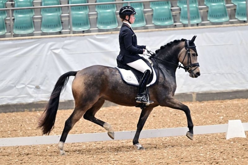 Dream of Rose is a light-footed and motivated dressage pony with excellent basic gaits and a reliable character. She has already won dressage competitions at the A and L levels against larger horses and is at an age-appropriate advanced training stage. FEI movements such as shoulder-in and travers are already within her repertoire for her age. Due to her rideability, willingness to perform, and potential, she is ideally suited for ambitious young riders aiming for an FEI career. She is also experienced in the outdoor and trail riding, showing calmness and confidence during hacks, and is equally uncomplicated and trustworthy in daily handling. If you are looking for a pony that is eager to grow with its rider toward FEI-level competition, please get in touch — Dream of Rose could be the perfect partner for this journey.