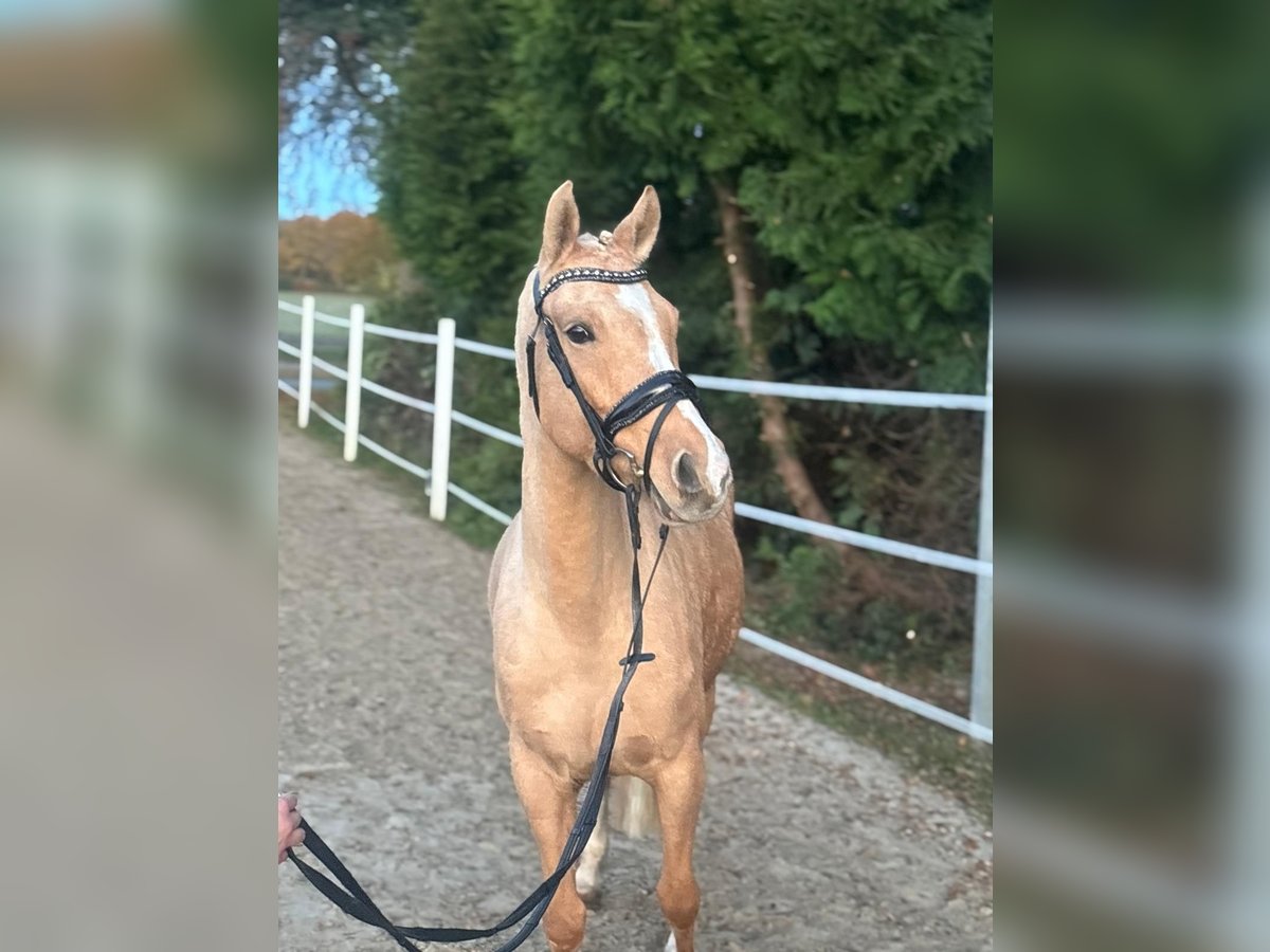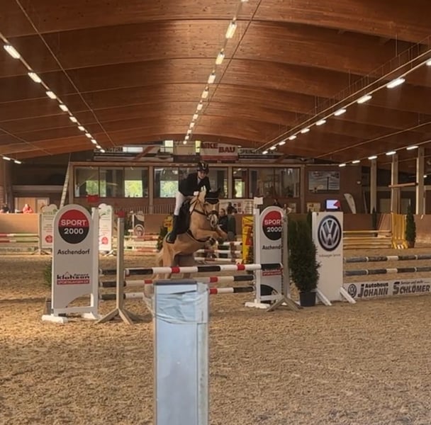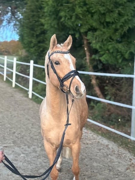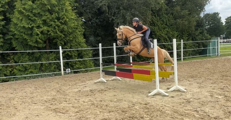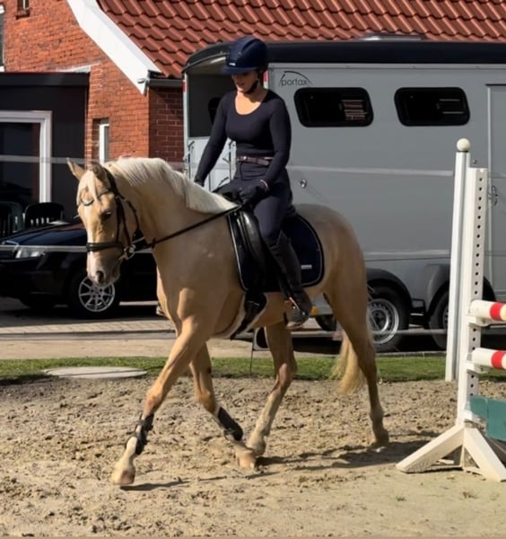 This charming Palomino mare combines beauty, elegance, and outstanding jumping potential – a true all-rounder! She has already completed her first small show jumping courses. She is diligent and eager to learn in training, with a wonderful temperament – very human-oriented. Whether as a competition pony for ambitious riders or as a leisure partner for hacking, she is also very interesting as a broodmare: she brings type, movement, and a jump-focused quality. Excellent jumping mechanics, good overview, and good timing – great potential for show jumping. 🌿 Breeding & Heritage This mare is not only athletic but also has breeding potential. 💫 Ideal for: • Ambitious young riders or adults looking to excel in show jumping • Families seeking a reliable pony for leisure and competitions. We are looking for a loving home for this gem. Vanilla is currently in Westoverledingen for riding and can be visited or test ridden there. Please contact us at 01744022800 or 059391321.