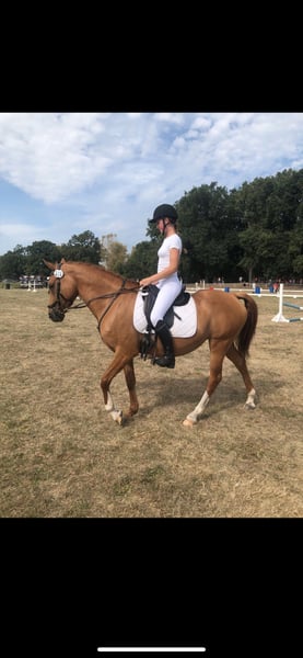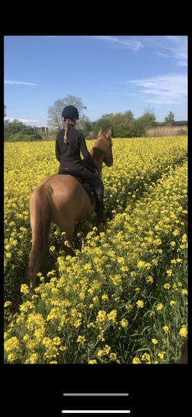 Delia is 6 years old, a German Riding Pony, and approximately 1.47 m tall. She is very manageable in the field, even for children or nervous riders, and going alone into the terrain is no problem! She is very brave and enjoys her daily work. In the arena, she is always well-behaved despite having plenty of go, and she is happy to do small jumps, although this is not her real passion. She loads calmly onto the trailer and is gentle during hoof care. Her teeth are regularly checked, and she has also been seen regularly by the osteopath and saddle fitter. At three months old, she developed a sway back, which does not cause her any problems, but she still needs to be trained from the ground accordingly! Due to her sway back, she is not suitable as a weight carrier; she should weigh under 60 kg. I have also worked a lot with her from the ground: she knows double longe, free work, free jumping, regular lunging, and desensitization training. I can imagine her as a mother-child pair, but an experienced person should be involved to actively train against the sway back. Thanks to her bravery in the field, I also see her as an excellent driving pony. I have already started lunging work with her, including long-rein work, even in the terrain. Currently, she is kept in an open stable; a pure box stall is not an option for her! Due to her back, despite her excellent pedigree, she is not suitable for breeding. I hope to find a wonderful home for her through this way!