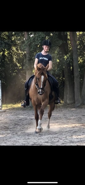 Delia is a 6-year-old German Riding Pony, approximately 1.47 meters tall. She is very manageable in the field, even around children or nervous riders, and can be ridden alone in the terrain without any issues. She is very brave and enjoys her daily work. In the arena, she is always well-behaved despite having plenty of go. She is happy to jump small fences, although jumping is not her true passion. She loads calmly onto the trailer and is gentle during hoof care. Her teeth are regularly checked, and she has seen the osteopath and saddle fitter regularly. At three months old, she developed a sway back, which does not cause her any problems. Nevertheless, she needs to be trained from the ground accordingly. Due to her sway back, she is not suitable as a weight-bearing horse; she should weigh under 60 kg. I have worked extensively with her from the ground, including double longe, liberty work, free jumping, regular lunging, and shock training. I can imagine her as a mother-daughter pair, but an experienced person should be present to actively train against her sway back. Thanks to her fearless nature in the field, I also see Delia as an excellent carriage pony. I have already started breaking her in, including long rein work, even in the terrain. Currently, she is kept in an open stable, as a box stall is not suitable for her. Due to her back, despite her excellent pedigree, she is not suitable for breeding. I hope to find her a wonderful new home through this.