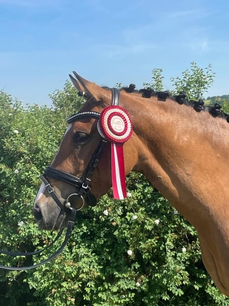 Aufgrund Bestandsverkleinerung geben wir unsere Staatsprämienstute "Loreley" in gute Hände ab. Loreley ist eine im schönen Ponytyp stehende Stute mit guten Grundgangarten. Als Dreijährige war sie Siegerin der Stutenleistungsprüfung mit einer herausragenden Wertnote von 8,25. Im Jahr 2021 erhielt Loreley den Titel der Staatsprämienstute und wurde Resevesiegerin der Deutschen Reitponys zum Sächsisch-Thüringischen Stutenchampionat in Wolfersdorf. Vor ihrem Zuchteinsatz wurde Loreley erfolgreich in Reit- und Dressurpferdeprüfungen eingesetzt. Im Jahr 2024 führte Loreley ein typvolles Hengstfohlen von DJ. Dieses wurde prämiert und qualifizierte sich für das Fohlenchampionat. Loreley vereint Leistungsgenetik in ihrem Pedigree. Väterlichseits finden sich die Stempel- und Leistungshengste Dimension AT und FS Don't Worry, Nachkommen aus dem Mutterstamm von Loreley sind hocherfolgreich im Sport, z. B. der Halbbruder "Notre Petit" ist sehr erfolgreich in FEI-Prüfungen und war 2024 Süddeutscher Meister in der Ponydressur. Eine Halbschwester war 2025 erfolgreich im Finale der Vielseitigsponys beim Bundeschampionat in Warendorf. Loreleys Halbbruder mütterlicherseits war 2025 Teilnehmer am Bundeschampionat Fahrponys in Moritzburg. Aktuell wird Loreley wieder an die Arbeit unter dem Sattel gewöhnt. Im Umgang zeigt sich sich brav und willig. Bei entsprechender weiterer Ausbildung und Förderung stehen ihr alle Wege offen.