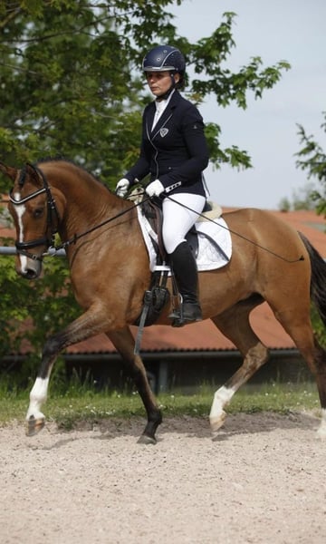 A causa di una riduzione del patrimonio, offriamo la nostra cavalla stallone premiata di stato "Loreley" a persone di fiducia. Loreley è una cavalla di tipo pony con ottime andature di base. Da giovane, a tre anni, è stata la vincitrice della prova di selezione delle puledre con un punteggio eccezionale di 8,25. Nel 2021, Loreley ha ricevuto il titolo di cavalla premiata di stato ed è stata riserve vincitrice delle Pony tedesche da dressage al Campionato delle puledre in Sassonia e Turingia a Wolfersdorf. Prima di iniziare la carriera di riproduzione, Loreley è stata con successo impiegata in prove di equitazione e dressage. Nel 2024, Loreley ha partorito un puledro stallone di tipo, figlio di DJ, che è stato premiato e si è qualificato per il Campionato dei puledri. Loreley combina una genetica di prestazione nel suo pedigree. Da parte del padre, si trovano stalloni di stampo e di prestazione come Dimension AT e FS Don't Worry. I discendenti del suo ceppo materno sono molto affermati nello sport, ad esempio il fratellastro "Notre Petit" ha ottenuto ottimi risultati in competizioni FEI ed è stato campione del sud della Germania nel dressage pony nel 2024. Una sorella half ha raggiunto la finale del Campionato federale di pony multi-disciplinari nel 2025 a Warendorf. Anche il fratellastro materno di Loreley ha partecipato nel 2025 al Campionato federale di pony da tiro a Moritzburg. Attualmente, Loreley si sta riabituando al lavoro sotto la sella. Nel suo approccio si mostra obbediente e volenterosa. Con una formazione e un'ulteriore stimolazione adeguate, le si aprono tutte le strade.