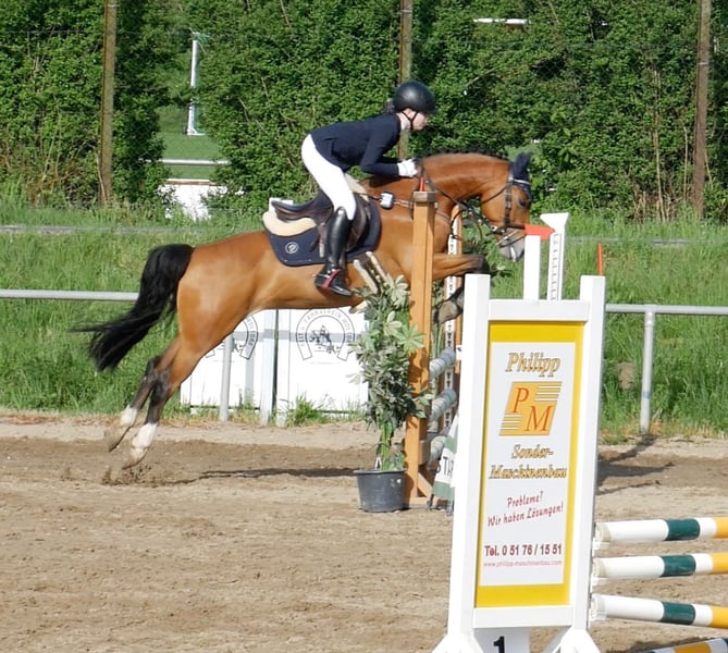 Leider neigt sich die Ponyzeit unserer Tochter viel zu früh dem Ende entgegen. Schweren Herzens bieten wir daher unsere Ponystute Milli zum Kauf an. Milli ist ein Sportpony, auf das im Pacours immer Verlass ist. Sie nimmt ihren Reiter zuverlässig mit auf die andere Seite und wird dabei nie heiß oder kopflos. Sie ist immer gut händelbar und eine echte Lebensversicherung. Durch Abstammung und Ausbildung ist sie aber sicherlich auch für die Dressur und Vielseitigkeit interessant (das Herz unserer Tochter schlägt primär für das Springen). Sie wurde aber auch immer in der Dressur gefördert. Im Springen ist Milli sehr turniererfahren, siegreich bis A** mit diversen 8er Noten und zeigt im Training deutlich Potenzial für mehr. Sie möchte aber auch entsprechend fein geritten werden. Aus diesem Grund können wir uns für sie sehr gut einen springaffinen, kleineren Erwachsenen oder ein Eltern-Kind-Gespann vorstellen. Milli ist im Umgang unkompliziert. Sie geht zuverlässig auf den Hänger, zeigt sich brav beim Hufschmied und geht alleine ins Gelände. Weiteres gerne in einem persönlichen Gespräch oder bei einem Probereiten. Um Milli vor Reittourismus zu schützen, berechnen wir für ein Probereiten 30€, welche natürlich beim Kauf des Pferdes verrechnet werden.