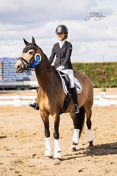 With a heavy heart, we are selling our beloved Secret. Secret is a 9-year-old German Riding Pony mare who impresses with her rideability and unbeatable character. At competitions, she always shows great nerves and gives the rider a secure feeling. Even in daily handling, Secret never displays any bad habits and is very people-oriented. She confidently masters rides in a group or alone. In training, the lessons of class M are still being "refined," but she is already hinting at lessons of class S, such as canter pirouettes. At competitions, she has achieved placements in class L with scores of up to 7.8. Secret is a true heart horse, and we wish for her to find a 5⭐️ home where she can also be a horse alongside sports. It is also important here: No urgent sale, placement before price! Videos can be sent upon serious interest.