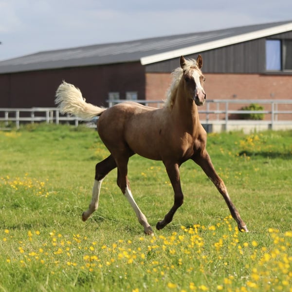 Beautiful first-premium foal offered. Winner of the all-round foal championship at the regional West NRPS inspection. Her mother is Liebharts Dream Girl, a mare with provisional keur status and radiographed. Sired by FEI stallion Del Estero. The sire is the Cremello stallion Rivers Dancing AS, a stunning German riding pony. Dahabi has been well-raised. He is familiar with everything: leading, grooming, washing, etc. As we expect foals every year, we are unable to keep them all. We are looking for a loving home for Dahabi.