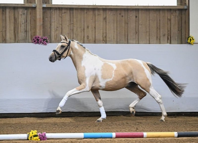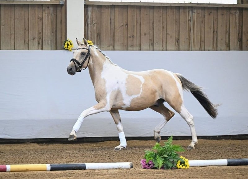 **Sales Advertisement: German Riding Pony Stallion** For sale is a promising German Riding Pony stallion, born in 2023, with a current height of 142 cm. His color is officially: Earthy Isabel Sabino. Not available for selection. This stallion is characterized by his friendly nature and willingness to learn. He is well suited for dressage and already shows promising potential in free jumping. He is lunged, fully vetted, including back X-rayed. "Zwerg" (his nickname) is well socialized (grew up in a stallion herd) and has an impeccable character. If you are interested or need further information, please feel free to contact me. Visit us and see for yourself this wonderful pony.
