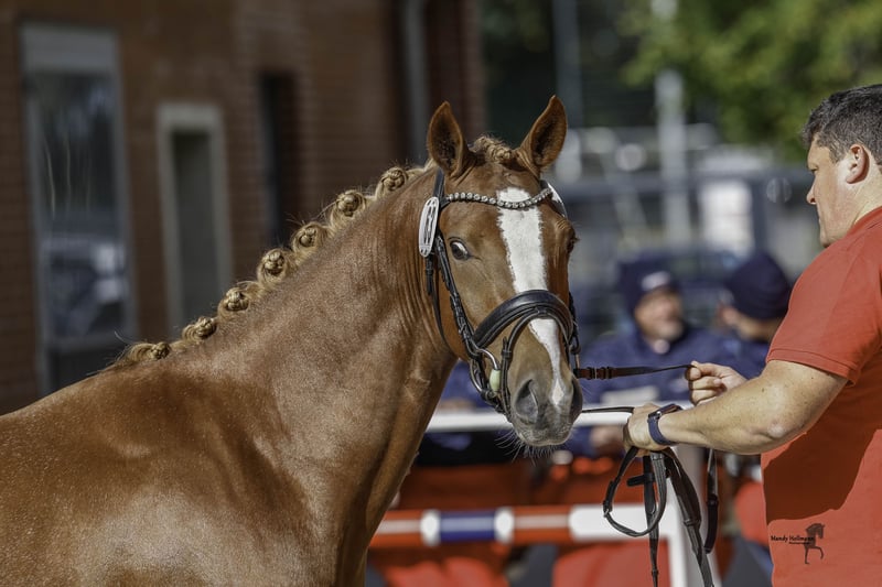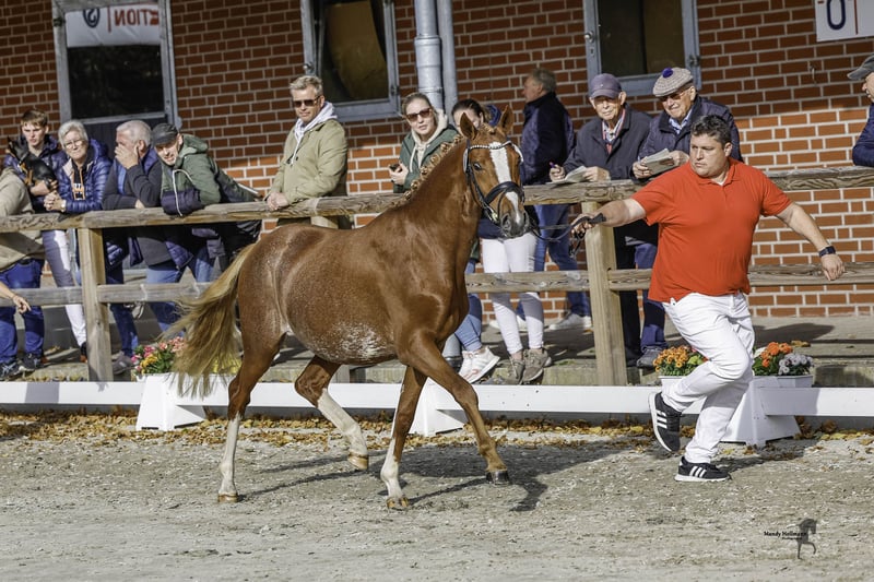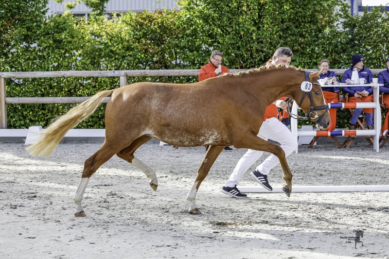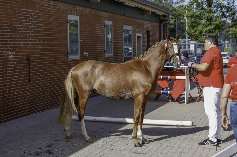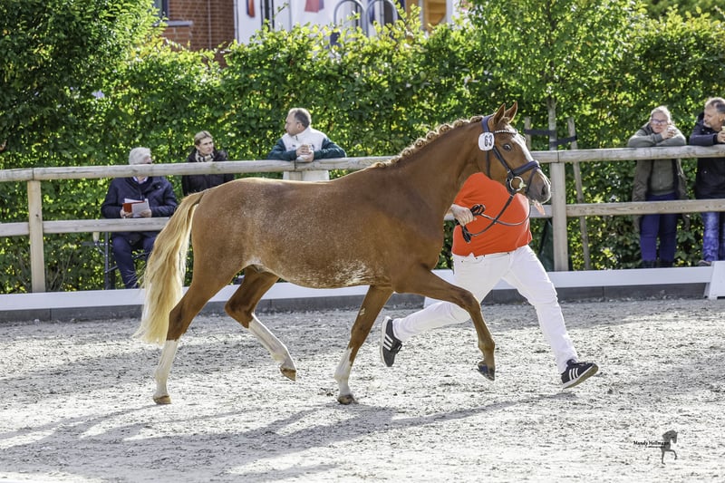 **For Sale: German Riding Pony Stallion** For sale is a promising German Riding Pony stallion, born in 2023. With his striking chestnut coat and a height of 145 cm, he is a real eye-catcher. This young stallion shows great potential in the field of dressage and is already very teachable and easy to handle. He has a pleasant, friendly nature. He is well-socialized and familiar with other horses. His basic training has already begun, and he shows a lot of joy in his work. If you are interested or have further questions, please feel free to contact me. Don’t miss this opportunity to acquire a talented partner for the future!