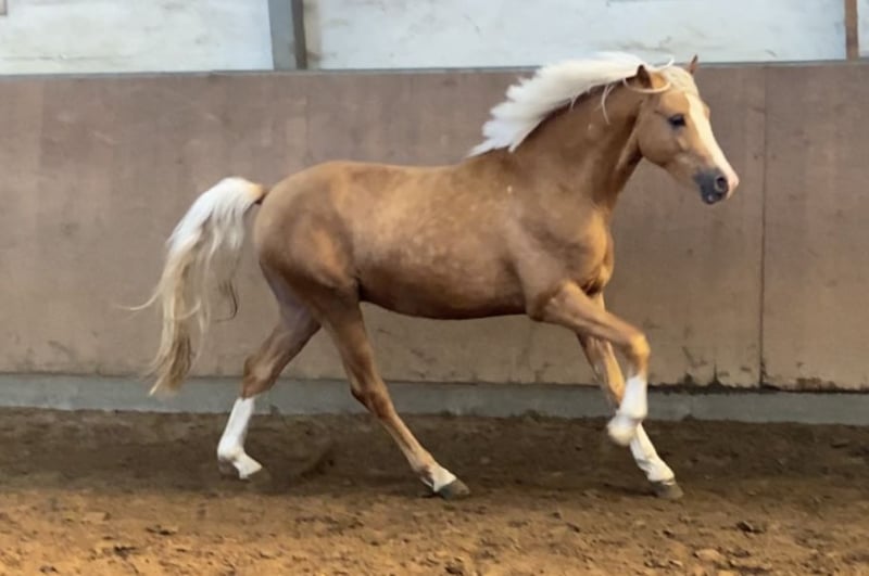 Corleon has a height of 146 cm at the withers. With his radiant palomino coloring, he is a true eye-catcher. This stallion has the potential to develop into a fantastic children's pony in dressage, and with his gentle nature and great attitude, he will bring much joy to his new family. He is well-socialized, friendly in handling, and has a balanced character. He has been beautifully raised on the marsh pastures of the Buchenhof stud. Corleon is very well-mannered and is already familiar with light work on the ground. If you are interested or would like more information, please contact me. Feel free to visit us and get to know this wonderful stallion in person!