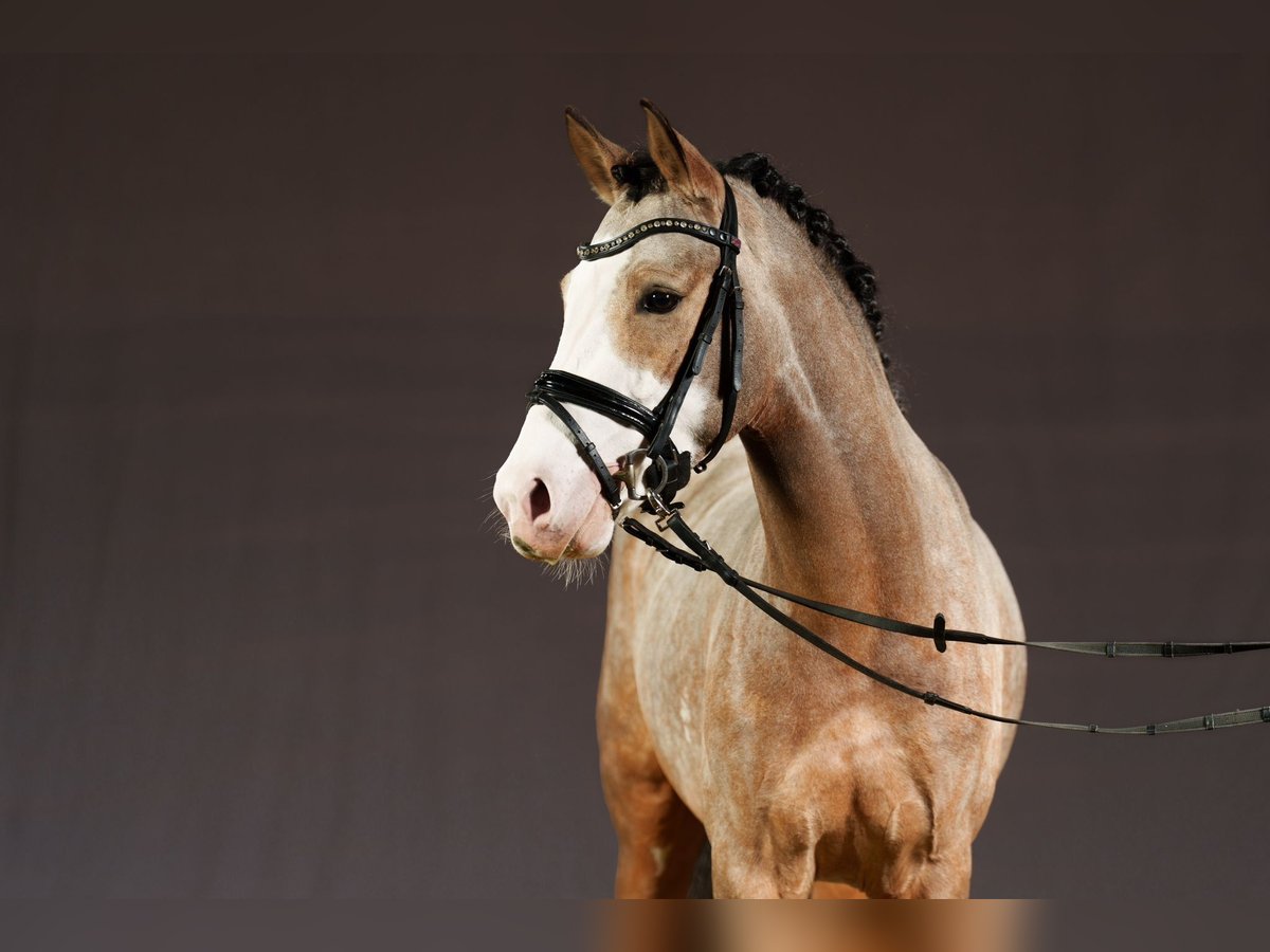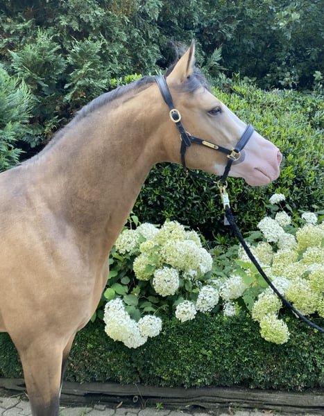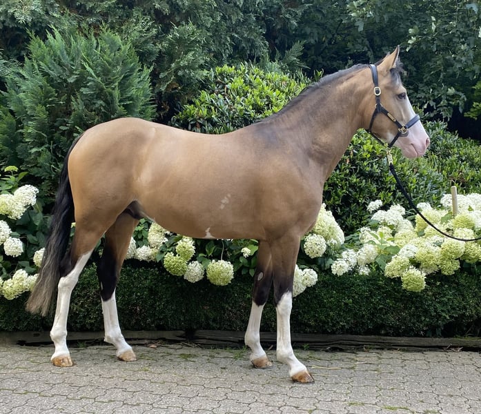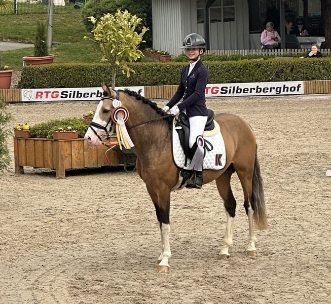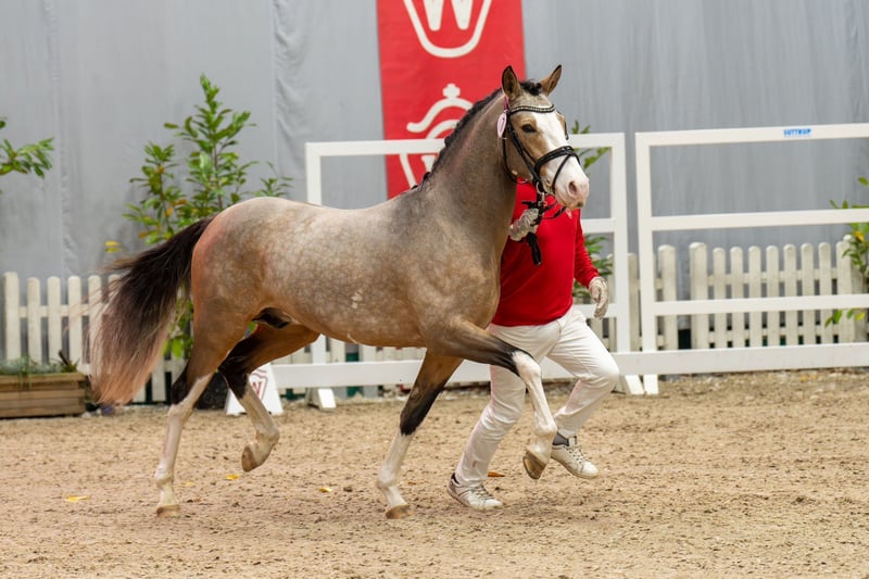 **Advertisement for sale: German Riding Pony Stallion** For sale is a promising young German Riding Pony stallion, born in 2022. This impressive brown sable dun stallion not only impresses with his eye-catching color, but also with his excellent movements and his potential in dressage and show jumping. With a height of 148 cm, he is ideal for ambitious riders looking for a talented young horse. His temperament and willingness to learn make him a pleasant partner in daily training. He loves to receive attention and loves to cuddle. This stallion is already showing promise in dressage and is ready to be developed further. He is healthy, well-bred and waiting to be passed on to loving and nurturing hands. He can be lunged or ridden in the arena with other horses (including mares) without any problems. He is also stabled with geldings, stallions and mares. The colorful stallion was licensed at the Westphalian main licensing in December 2024, the free jumping video can be sent via Whatsapp on request. It is also possible to have the stallion trained further by us, If you are interested or require further information, please do not hesitate to contact us. Viewings and test rides are possible by arrangement. The stallion is not right for you? We have ponies and large horses in various age groups.