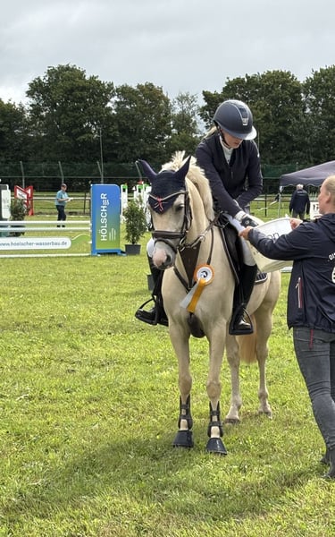 Mrs. Robinson ist eine schicke Stute mit drei sehr guten Grundgangarten und viel Vermögen, sowie Übersicht am Sprung. Nach dem sie ein Fohlen bekommen hat, wurde sie dieses Jahr das erste Mal an den Turniersport herangeführt und konnte sich direkt einige goldene Schleifen abholen! Nicht nur in Clearroundspringen der Klasse A* sonder auch in der Eignung war Mrs. Robinson erfolgreich und konnte diese gewinnen. Im Parcours gibt sie dem Reiter ein gutes Gefühl und hilft auch mal bei Fehldistanzen, ohne nachtragend zu sein. Sie ist mutig und hat kein Problem mit außergewöhnlichen Sprüngen, wie Wassergräben. Aber auch in der Dressur ist sie überzeugend. So konnte sie bereits eine Eignung für sich entscheiden (Dressur 7,5 ; Springen 7,9). Sie läuft in der Abteilung sowohl hinten als auch vorne und beherrscht schon einige Lektionen der Klasse L. Mrs. Robinson ist beim Ausreiten super brav und hat sogar Spaß daran, durchs Wasser zu gehen. Deswegen und aufgrund ihres raumgreifenden Gallops könnten wir sie uns auch gut als Vielseitigkeitspony vorstellen. Da es sich um eine in junges Pony handelt, welchem Sicherheit durch den Reiter vermittelt werden sollte, wird Mrs. Robinson nicht als Anfängerpony angeboten.