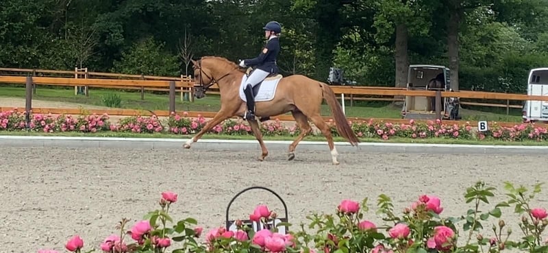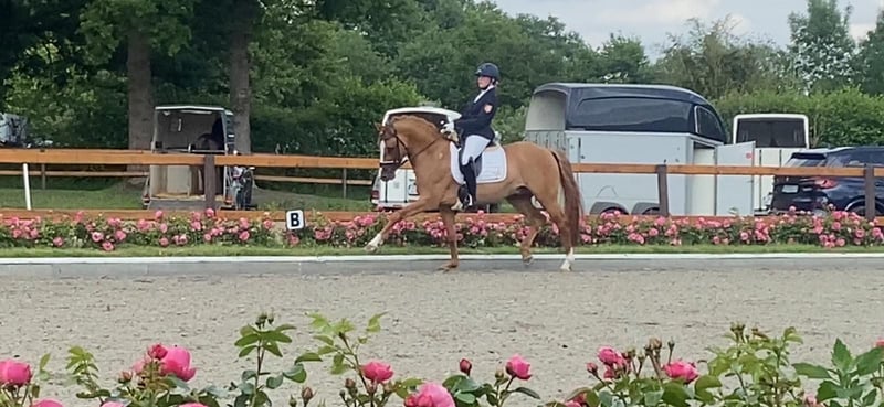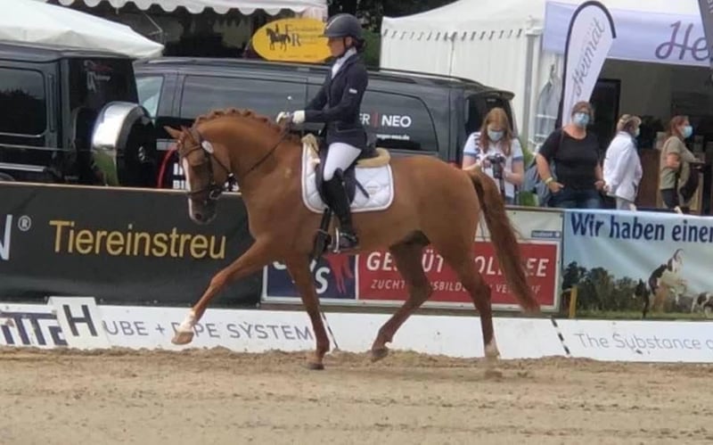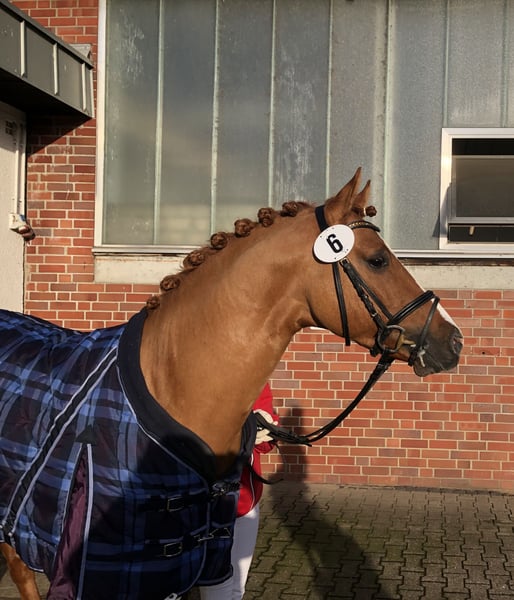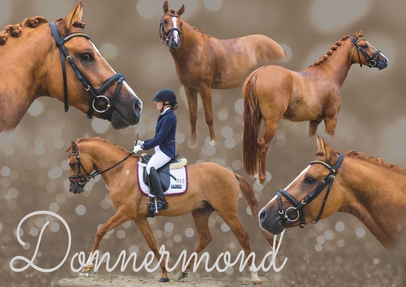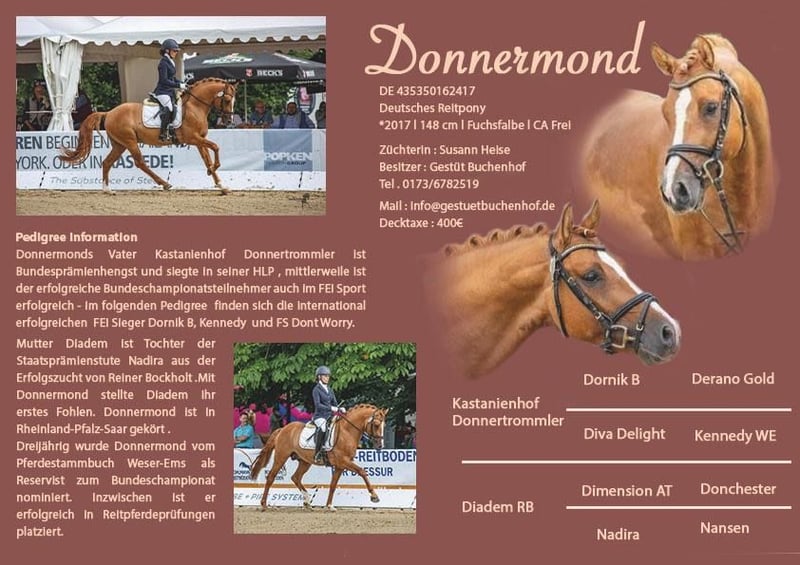 Donnermond es un poni alemán de doma, aprobado como semental de alto rendimiento. Aprobado en Rheinland-Pfalz-Saar, Westfalia y Hannover. Evaluado en Münster-Handorf con excelentes notas (8,0 en manejabilidad). Semental de alto rendimiento. Presentado en la Bundesstutenschau en Berlín, con premio. Colocado en competición de nivel A en doma clásica. Clasificado para el Campeonato Federal (de 5 años). Nivel de entrenamiento: L en doma clásica / FEI / en bocado. Le encanta salir a pasear y, incluso sin silla, pasa por todo con una cuerda de cabeza. Su madre es una yegua de élite. Un medio hermano acaba de clasificar para las campeonatos de Frisias, y otro hermano aprobado ha obtenido excelentes resultados en concursos de ponis y en el campeonato regional. Buscamos un hogar excepcional, con conexión familiar y acceso diario a pastar. Donnermond puede estar en cercado con ponis enanos o con otros machos, lado a lado; le encanta acurrucarse. Solo entregamos en manos de personas responsables y comprometidas. Necesita su tiempo diario en el campo. Queremos un hogar para siempre, preferiblemente con instalaciones propias o en una finca. Donnermond no muestra interés en concursos y no es fértil. Actualmente, está en entrenamiento en Lüneburg, con acceso diario a campo y contacto con otros caballos; está muy feliz con ello. Pero, dado que su descanso no es gratuito, queremos aprovechar esta oportunidad para encontrarle un hogar maravilloso.
