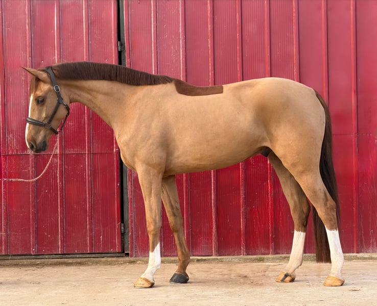 Yegua de 4 años, de 1.65 m, por Defender (Dominator Z) x Vigo Darsouilles. En entrenamiento estándar, montada. Con TUV sin informe veterinario. Por favor, contacta únicamente por WhatsApp: 004366475427490.