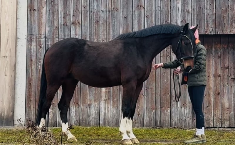 Se ofrece a la venta un prometedor caballo de deporte alemán, un gelding nacido en 2022. Este elegante castaño oscuro con cuatro patas blancas destaca por su constitución armoniosa y su potencial prometedor en la doma clásica. Con una altura de 1,66 m, ofrece la talla perfecta para jinetes ambiciosos que buscan un compañero fiable para la competición ecuestre. El joven gelding está montado de manera apropiada para su edad y muestra un carácter muy obediente y dispuesto a aprender. Su actitud agradable y su carácter cercano a las personas lo convierten en un compañero entrañable para el entrenamiento diario. Dado que solo tiene 4 años, necesita un jinete que le brinde mucha seguridad y que quiera acompañarlo en su camino de formación. Ya está familiarizado con paseos largos en el campo, entra en el remolque, está castrado y es muy sociable con las personas. Tiene mucho temperamento, pero se mantiene manejable y tranquilo (sin cabriolas, broncos, ni otros comportamientos problemáticos). Vermentino también podría quedarse aquí para continuar su entrenamiento. Si está interesado o tiene alguna pregunta, no dude en contactarme para más información o para concertar una visita.