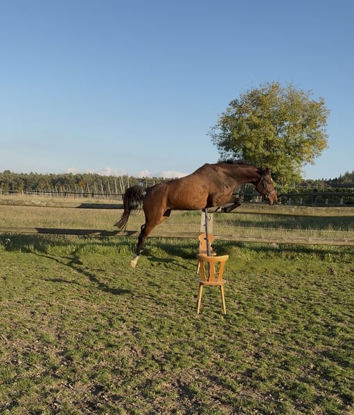 For sale: German Sport Horse – Ideal for leisure and sport We are offering a beautiful dark bay gelding, born in 2021. Standing at 16.1 hh, he combines classic sporthorse qualities with plenty of charm. This versatile leisure partner is well-prepared for riding life and demonstrates exceptional reliability and friendliness both in handling and in the field. Castano is comfortable with rider weights in walk and trot, both on the riding arena and in open terrain. X-rays of the front legs show no findings. The price is negotiable for quick decision-makers. He is sure to become a wonderful partner someday! Pedigree: Dia Corrado x Ramiro's Match x Wertschatz I have owned him since 2022 and have prepared him to the best of my ability for riding. Castano is a affectionate and gentle gelding. He is familiar with all farm noises, whether it’s a brush cutter or a front loader, and remains completely calm in all situations. Currently, he is kept in a pasture with a herd of geldings, where he enjoys playing and socializing. He gets along well with other horses and has always been easy to integrate into new groups. Castano is a very people-oriented horse who enjoys learning new things, whether it's performing a Flehmen on command or the horse yoga pose. He has a lot of fun during training. If you are interested or have further questions, please feel free to contact me. Arrange a viewing appointment and see for yourself what a fantastic horse he is!