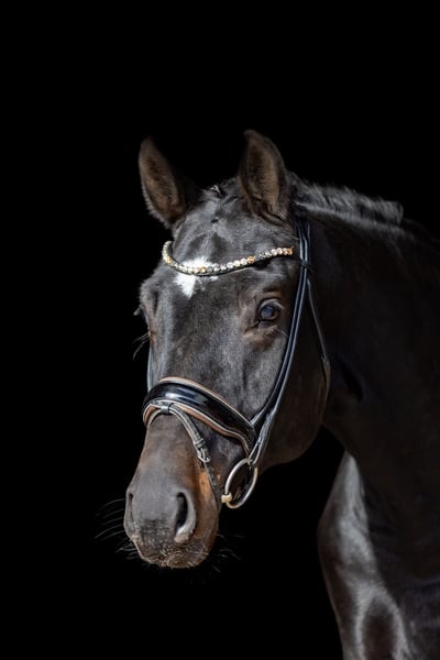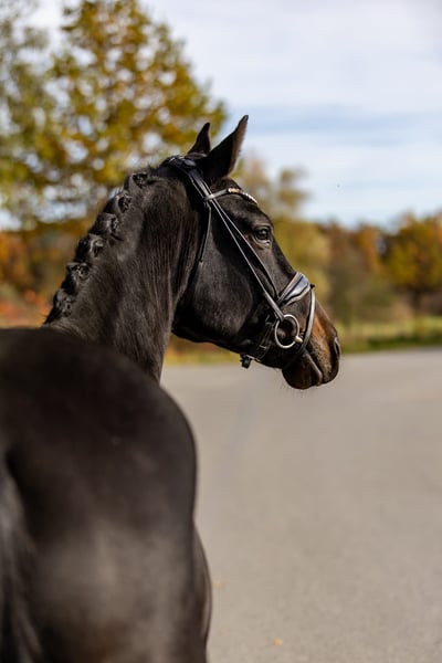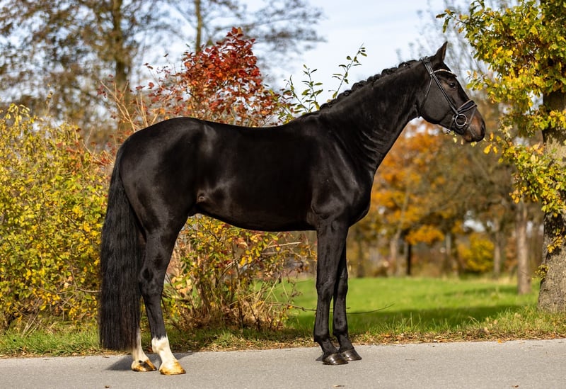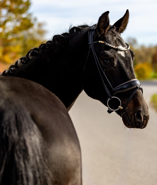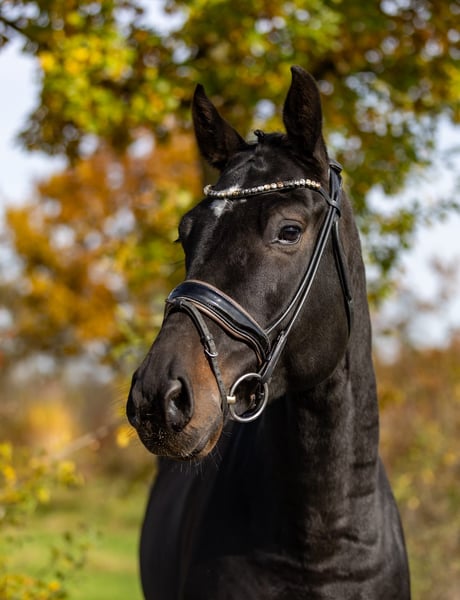Bon Jovi is a very handsome dark bay gelding with correct conformation and an equally impressive temperament. He impresses not only with his attractive appearance but especially with his calm and well-balanced character. Under saddle, Bon Jovi consistently remains focused and attentive. External stimuli such as tractor noises, hoofbeats, or other sounds do not disturb him — he stays reliably with his rider and provides a secure feeling. He is truly dependable. Bon Jovi is four years old, making him ideal for a rider with some experience working with young horses. Nevertheless, he is very straightforward and pleasant in daily handling. With age-appropriate and consistent training, he will undoubtedly find his path in dressage. He also shows his best qualities in the stable and during daily handling: he is very well-behaved, enjoys grooming, being stroked, and cuddled, and is very trusting and affectionate towards people. Under saddle, he is honest, uncomplicated, and a pleasure to ride. Thanks to his excellent canter, clear head, and good overview, we can also see Bon Jovi as a potential vaulting horse in the future. We purchased Bon Jovi directly from the breeder and have personally backed him. He is now confidently ridden, mastering the three basic gaits, and has developed very positively. He is a quick learner, and once something is taught, it remains reliably ingrained. A truly kind, dependable young gelding who will bring his future owner much joy. Location: Rosenheim