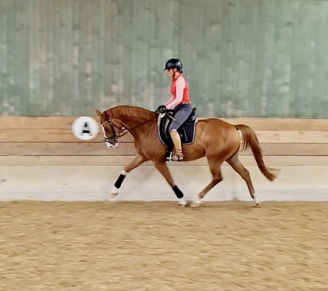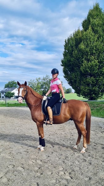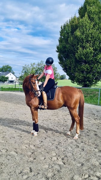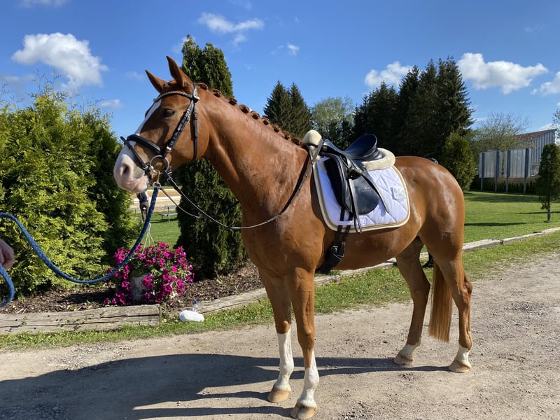 German Sport Horse – ideal partner for an ambitious amateur or recreational rider! For sale is a beautiful chestnut gelding, born in 2019. He was purchased as a foal and is awarded as a gold foal. He is kept in a family environment with daily turnout on pasture. The horse has a comfortable height of 16.3 hh and boasts three excellent gaits. With his elegant appearance and balanced temperament, he is a reliable partner for an aspiring rider. He impresses with a solid basic dressage education (L-level), has competition experience, and is familiar with pole work and small jumps. His friendly nature makes him a pleasant companion for experienced riders. Due to lack of time, he is available for sale. Please feel free to contact me for further information or if you are interested.