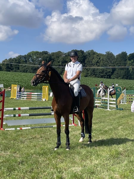 We offer a talented gelding of the breed: German Sport Horse, year of birth: 2019, color: bay, height: 170 cm for sale. This promising 6-year-old gelding by Karajan out of a mother by Cardenio impresses with his committed performance in the course. He has great potential in show jumping. His mother has already produced successful offspring in show jumping, such as his half-sister Dear Princess, who was placed up to S* level and was able to become the champion mare of the state premium show in Prussendorf in 2022! The gelding is well-mannered, well-trained, easy to load, and has already gained experience and successes (victorious in show jumping A**) at competitions up to class L. He is healthy (X-rays available), regularly vaccinated, and dewormed. If you are interested or have any questions, we look forward to your message!