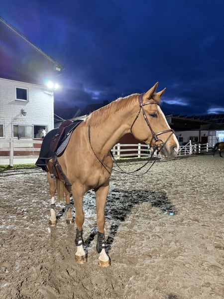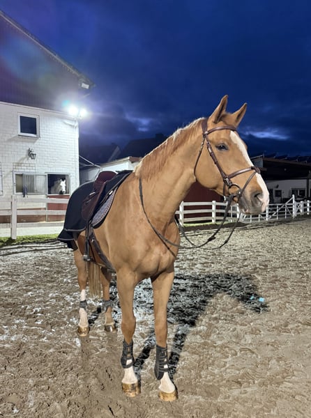 Maverick ist ein 7-jähriger Fuchswallach (Manchester van’t Paradijs x Landprinz) mit einem Stockmaß von 1,75 meinem liebenswerten Charakter und viel Qualität. Ein Pferd, das man von Anfang an ins Herz schließt. Er ist freundlich, aufmerksam und sehr menschenbezogen, dabei angenehm und unkompliziert im täglichen Umgang. Unter dem Sattel zeigt er sich ausgeglichen und immer auf der Seite seines Reiters. Er denkt mit, bleibt auch in neuer Umgebung gelassen. Maverick vermittelt seinem Reiter ein sicheres Gefühl – egal ob auf dem Platz, in fremder Halle oder im Gelände. Seine besondere Stärke liegt im Springen. Maverick ist bis M* platziert und konnte sich 2025 für das Bundeschampionat qualifizieren. Dort, wie auch im Training, zeigt er sich mutig, vorsichtig und sehr souverän am Sprung. Er bringt viel Qualität mit und ist dabei jederzeit rittig und gut zu regulieren. Trotz seines Vermögens wird Maverick im Parcours nicht heiß, sondern lässt sich auch im täglichen Training und zwischen den Sprüngen jederzeit ruhig und kontrolliert reiten. Er hat Einstellung und vermittelt Sicherheit. Damit eignet er sich ideal für einen Reiter, der sich im Springen weiterentwickeln und im A- bis L-Bereich erfolgreich auf Turnier unterwegs sein möchte oder auch für einen ambitionierten Pony-Umsteiger ist er gut vorstellbar. Dressurmäßig wird Maverick ebenfalls gefördert und befindet sich auf einem guten A- bis soliden L-Niveau. Maverick ist schmiede- und verladefromm, regelmäßig geimpft und entwurmt. Aktuelle Röntgenbilder liegen vor und können bei ernsthaftem Interesse gerne eingesehen werden. Der Verkauf erfolgt im Auftrag des Besitzers. Da im Stall junge Pferde nachrücken und die Plätze begrenzt sind, wird Maverick aus Bestandsgründen abgegeben. Wir wünschen uns für ihn ein passendes Zuhause, in dem er weiter gefördert und wertgeschätzt wird.