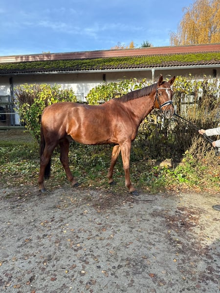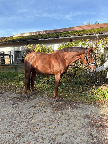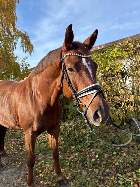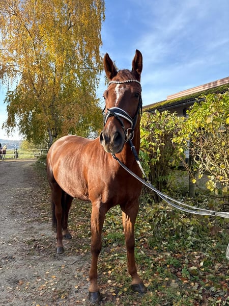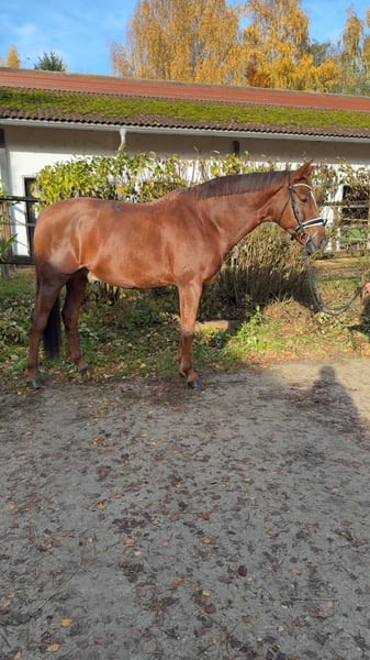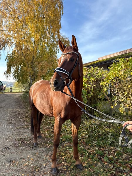Very stylish gelding, eight years old, directly from the breeder. Very solidly trained! Training level between L and M dressage with a very pleasant go. He masters all M-level exercises, but not yet effortlessly. He loves going out on trails and enjoys jumping (E-level). He is extremely rideable, very sensitive to leg and hand, and always wants to do everything right. No matter who is riding him, whether a professional, amateur, or a 13-year-old pony girl (Thank you, Sophia ;), who rides him for the first time in the video... he is always fun, super relaxed, and tries to do it right! He is very comfortable to sit on and is very kind in handling. His sister, Lady Darcy, is highly successful in S*** dressage. He eagerly loads into the trailer and is well-behaved during shoeing. He is very compatible with other horses. However, he does not like to be sprayed with fly spray – dabbing is fine 😉. A very, very healthy horse! He had a very good vet check at four years old. This boy is looking forward to close family connections! Optionally available with all equipment including a custom Hennig saddle for an additional cost.