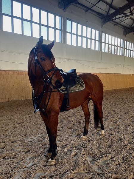 For sale is a beautiful 8-year-old gelding. Prince Albert is a German Sport Horse, sired by Prinz Ludwig x Glacier. He stands at approximately 177 cm. He has placed in A** show jumping and is ready for L-level competitions. He is blacksmith and loading friendly, vaccinated, and his teeth have been regularly checked. He has been presented multiple times to an osteopath and a saddler. A vet check without findings from October 2024 is available and can be sent upon request. In daily work, he is curious and very well-behaved. He is familiar with jogging on the lead, cows, sheep, dogs, and noisy vehicles such as tractors, and has no issues with them. He is well-ridden in dressage work and masters A-level exercises as well as some L-level exercises. He knows how to lunge and has been gradually introduced to long-lining (still needs some practice in this area). In jumping, he is equipped with enough go and can be easily ridden by advanced riders. He is not spooky and jumps any type of obstacle, including water jumps, without problems. At competitions and during off-site training, he shows himself to be willing to work, just like at home. He loads easily with other horses and also alone. We have often taken him out in a group and also alone in the field, where he proves to be an absolutely reliable horse, even under a less experienced rider. Therefore, I can also imagine him as a dependable partner for the discerning leisure rider. Prince is well-socialized. He gets along with both geldings and mares and travels very calmly in a trailer with unfamiliar horses. He is currently kept in an open stable but is also familiar with box stalls. Due to an injury on my part, he has unfortunately not been presented at competitions this year. He has been jumped in recent months by an acquaintance. I would be happy to provide current training videos upon request. He is sold including a bridle (less than a year old). Are you interested? Then we can gladly arrange an appointment for a trial ride. Feel free to contact me via WhatsApp or call at 0157 85922936.