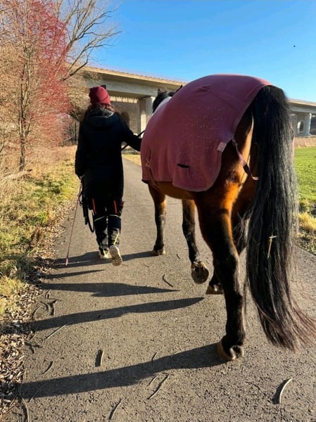 8 jähriger Wallach, dt. Sportpferd, Stockmaß ca 1,70 m sucht neuen Wirkungskreis Spirit ist ein Jungspund, der leicht angeritten ist. Er kennt Schritt und Trab unter dem Reiter, sowohl an der Longe als auch frei im Roundpen. Bedingt durch eine Schwangerschaft saß ich im März zuletzt auf ihm. Reiterlich zeigte er bisher keinerlei Unarten. Aktuell wurde er wenig bis gar nicht gearbeitet. Es bedarf also etwas Muskelaufbau, bevor sich wieder ein Reiter auf ihn setzen kann. Spirit möchte gern gefallen und ist ein lern- und arbeitswilliges Pferd. Er ist Dressur gezogen, hat aber auch Spaß am Springen (muss jedoch wieder heran geführt werden -> Freispringen, bisher nie mit Reiter) Spirit läuft barhuf und wurde regelmäßig beim Schmied vorgestellt. Verladen ist nicht unbedingt seine Lieblingsdisziplin, was jedoch eher an mangelnder Lust seinerseits liegt, statt an Angst. Im Offenstall fühlt er sich am wohlsten, kennt aber auch Boxenhaltung über Nacht. Spaziergänge allein sind kein Problem. Spirit ist erprobt bei Brückenüberquerung (keine aus Holz), unter Autobahnbrücken durch, Schafe, Kühe, andere Pferde auf Koppeln, Fahrradfahrer, rollerfahrende Kinder, Kinderwagen, Traktoren, Züge und einiges Anderes. Für weitere Fragen oder Videos könnt ihr euch gern melden.