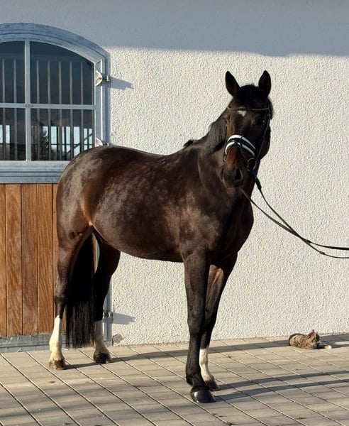 Vielseitige Diacontinus-Tochter mit Herz. Wir suchen für unsere 10-jährige Stute Daphne ein neues, förderndes Zuhause. Daphne ist eine elegante Partnerin, die durch ihre Abstammung, ihre Rittigkeit und ihr charmantes Wesen überzeugt. Eckdaten im Überblick: • Name: Daphne • Alter: 10 Jahre (geb. 2016) • Stockmaß: ca. 160 cm • Abstammung: Diacontinus x Granulit • Gesundheit: Aktuelle Röntgenbilder von 2023 liegen ohne besonderen Befund vor. Ausbildung & Charakter: Daphne ist eine feine Stute mit angenehm zu sitzenden Gängen, die dem Reiter ein tolles Reitgefühl vermittelt. Sie ist solide ausgebildet: • Dressur: Sie beherrscht Seitengänge sicher; mit den fliegenden Wechseln wurde bereits spielerisch begonnen. • Springen: Sie springt einen kleinen Parcours mit Übersicht und Freude. • Working Equitation: Hier konnte sie bereits erste Erfahrungen sammeln und zeigt sich geschickt an den Hindernissen. • Gelände: Daphne geht gerne ins Gelände und ist eine tolle Begleiterin für Ausritte. Anforderungen an den Reiter: Daphne ist im täglichen Umgang brav und unkompliziert. Unter dem Sattel ist sie sehr leichtrittig, sofern sie eine klare Führung erhält. Sie ist kein reines Anfängerpferd, sondern sucht einen durchsetzungsfähigen Reiter, der ihr Sicherheit gibt. Wenn die Chemie stimmt und die Hierarchie geklärt ist, geht sie für ihren Menschen durchs Feuer. Zusammenfassung: Daphne ist das ideale Pferd für ambitionierte Freizeitreiter oder Umsteiger, die ein schickes, vielseitiges Pferd für Dressur, Working Equitation oder kleine Sprünge suchen. Die Stute hat einen Überbiss der vom Tierarzt als unbedenklich eingestuft wurde. Bei Interesse bitte melden: 017651788446