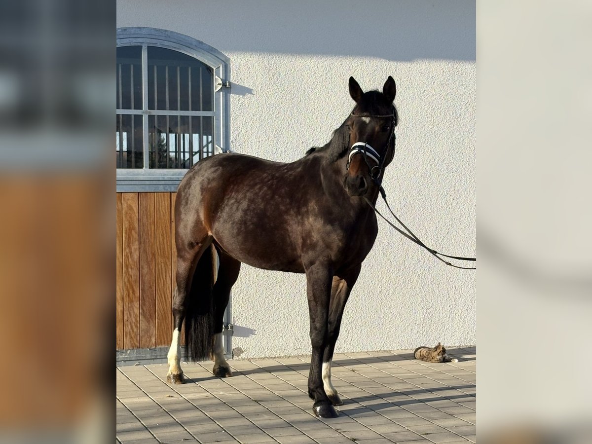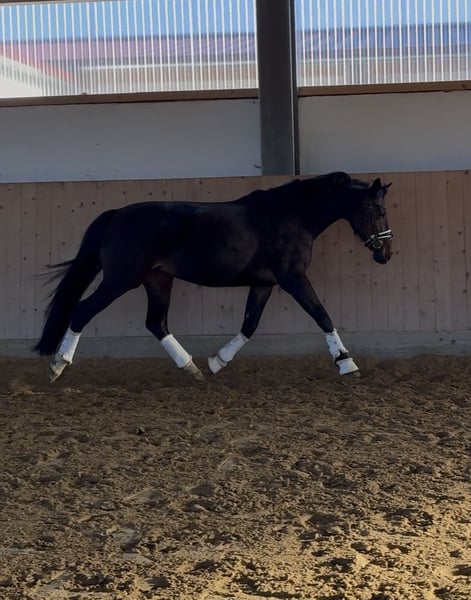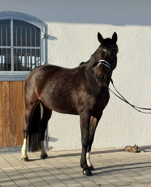 Beautiful 10-year-old Diacontinus daughter! 16.0 hh Daphne is well-behaved and well-mannered both on the ground and under saddle. She is currently ridden regularly in the arena and in the field. She is familiar with lunging on double longe, dressage work, working equitation, and jumps small courses. However, she is not suitable for complete beginners or nervous riders. She does not buck or rear! Daphne is very light in the mouth and masters all kinds of lateral movements. Flying changes have been introduced. Due to health findings that do not affect her performance, she is being offered at a significantly reduced price. Video available. Please contact via WhatsApp directly at 017651788446.
