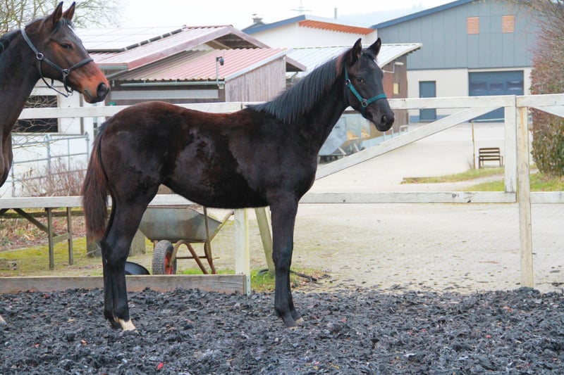 Wir bieten hier ein hübsches, bewegungsstarkes Stutfohlen aus 2025 mit allerbestem Charakter an, sie ist selbstbewusst und mutig, sehr lieb und verschmust - und sie freut sich immer wenn der Mensch kommt. Tiana besticht außerdem durch ein absolut korrektes und stabiles Fundament und 3 völlig klare und korrekte GGA, wodurch die besten Voraussetzungen für lange Gesundheit und Haltbarkeit gegeben sind. Mutter und Halbschwester können besichtigt werden und bestätigen dies, ebenso wie der Halbbruder der letztes Jahr gekört wurde! Beide Geschwister waren auch super brav und unkompliziert beim anreiten! Tiana wurde am 14.06.2025 geboren und war bereits mit knapp 5 Wochen auf der Fohlenschau - das hat sie total brav gemeistert und trotz des jungen Alters bereits die Silberprämie vom Verband erhalten! Sie ist natürlich halfterführig, kennt das Fohlen-ABC und ist mit ihrer Mutter zusammen schon Hänger gefahren. Auch die ersten Ausritte bei Fuß ihrer Mutter hat sie schon völlig souverän und unerschrocken gemeistert. Geschätzt wird sie ca. 170cm groß. Im Moment wächst sie in der Herde auf, ist nachts im Stall, aber tagsüber jeden Tag bei Wind und Wetter draußen. Wir wünschen uns eine liebevolle und artgerechte Aufzucht und können sie uns später in verschiedenen Bereichen vorstellen, wobei ihr das Dressurtalent von ihrem Vater natürlich in die Wiege gelegt ist. Bei Bedarf kann sie auch ins neue Zuhause gebracht werden. Standort ist 69151. Gern einfach melden und vorbeikommen, hier wächst eine ganz tolle junge Dame heran!