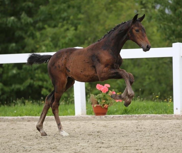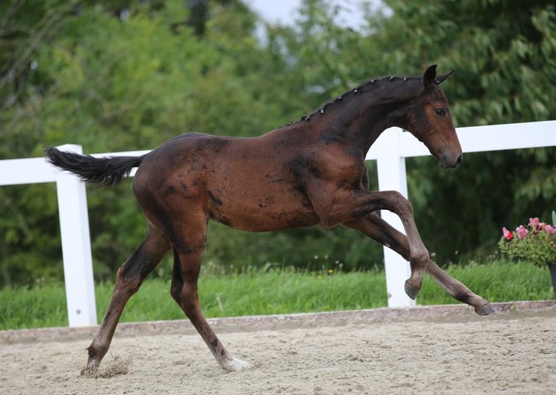 For sale is a filly by Vagabond, who has been successful in show jumping with Hendrik Sosath at high levels. This young mare impresses with her large frame and solid build, showcasing beautiful movement through her body, particularly her powerful gallop. Her exceptionally pretty head completes the overall picture. Her mother, Weissa Colett, has already produced promising offspring, with the first currently competing in sports. Her maternal grandfather, Casiro, not only impressed with his own performance (e.g., winning a puissance class over 2.10m) but also with his rideable, clear-minded offspring. The foal comes from the Weissena line, which is particularly known for the dressage star Weihegold OLD.