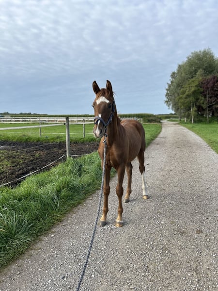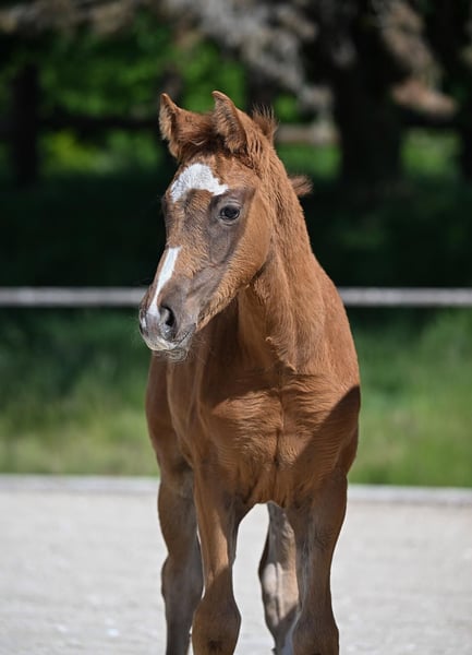 Typvolle DSP Jungstute, geboren 2025. Eine kompakte Fuchsttute mit auffälliger Blesse, harmonischem Körperbau und insgesamt sportlicher, eleganter Erscheinung. Sie wächst altersgerecht im Herdenverband auf und zeigt sich im Umgang aufgeweckt, zutraulich und stets neugierig. Dabei ist sie menschenbezogen und bringt ein angenehmes Temperament mit. Gezogen mit Blick auf die Dressur, lässt sie bereits jetzt ihr Potenzial erkennen. Als Fohlen wurde die Stute prämiert. Aufgrund des Alters wird das Pferd ausschließlich in erfahrene und fördernde Hände abgegeben. Wir bitten um Verständnis, dass reine Preisanfragen oder Verhandlungsfragen nicht beantwortet werden, da es sich um ein Lebewesen handelt und uns ein passendes Zuhause wichtiger ist als ein schneller Verkauf. Bei ernsthaftem Interesse freuen wir uns über eine Kontaktaufnahmen, beantworten gerne weitere Fragen und stellen zusätzliches Bild- und Videomaterial zur Verfügung. Eine kurze Vorstellung der eigenen Person hilft uns dabei, besser einzuschätzen, ob Pferd und Mensch gut zusammenpassen. Anfragen gerne auch per WhatsApp unter +4915560581906