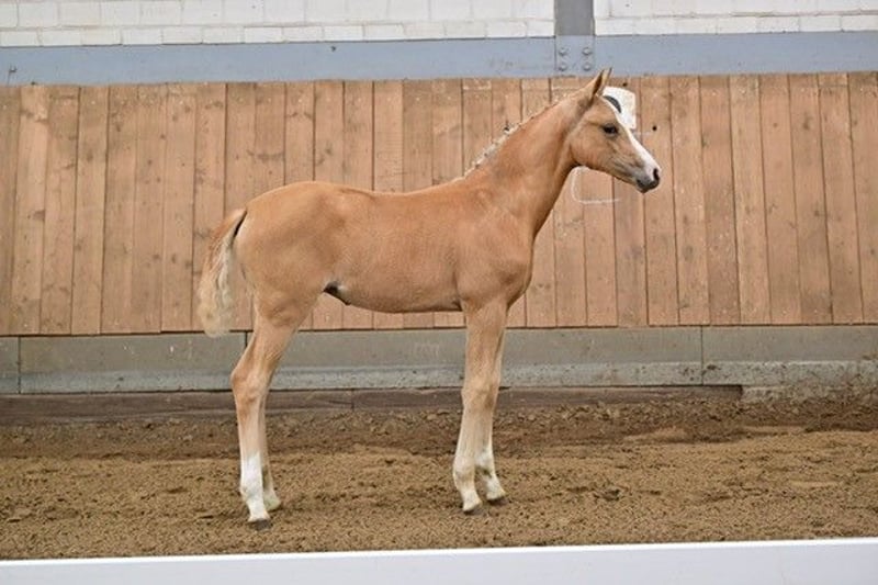 Name Cuba NL Date of birth 23.03.2024 Color Fuchsisabell (Palomino) Sire: Cooper County WE Dam: Charlette StPr Dam's sire: Charmeur Typey Brillantring filly Cuba NL not only impresses with her typey and elegant appearance, but also with very good movements and an impeccable character. Directly from the breeder, born with us and raised in a foal herd with lots of pasture. Regularly wormed, halter trained and farrier friendly. She knows the foal ABC. Her dam "Charlette" (state premium mare) has now brought her third foal in a row to the foal championships in the Brillantring with Cuba NL. Cuba NL leaves nothing to be desired, she has qualities in all directions and is almost certain to reach the final standard. We are only giving her away because her dam is still quite young and already in foal again and her big sister (S: Numero Uno) is already waiting in the wings. Dam and siblings can also be viewed. She could also stay with us for foal rearing if required.