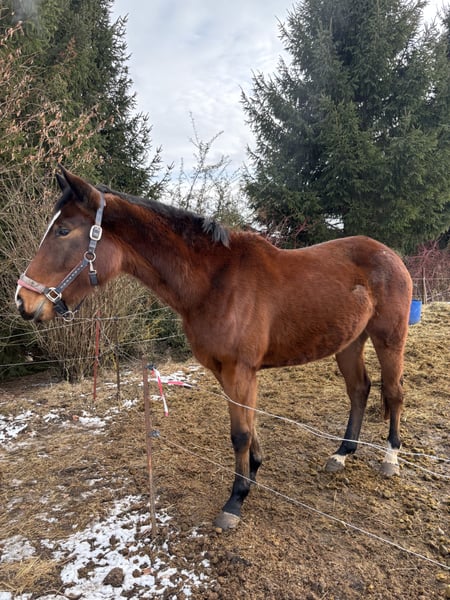 The mare is still untrained and is looking for a rider who wishes to develop her further. She is well-behaved in handling and has a strong genetic foundation for sport.