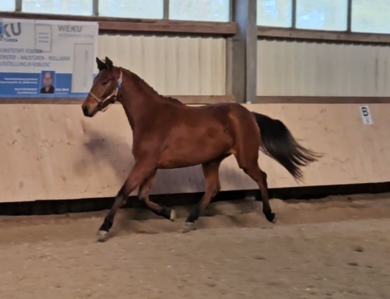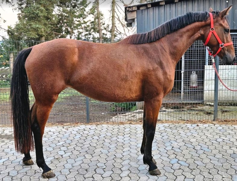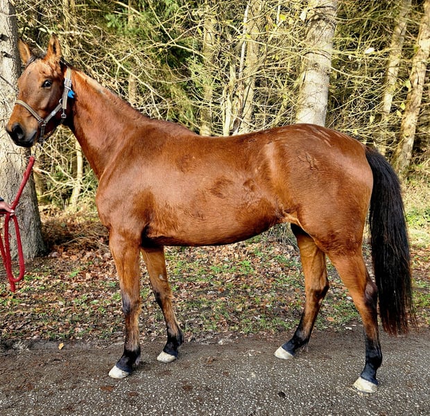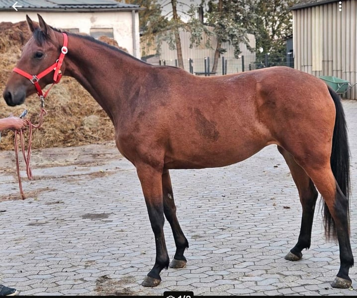 For sale: Elegant and talented German sport mare – born in 2022. This mare is still in a rough, halter-trained state and has been lightly lunged. She has been in training for 14 days and grew up in a young horse herd. She is very social and well-mannered with other horses. Due to the lack of a rider, she is offered as a rough, unmounted horse. This beautiful mare combines versatility with potential. Standing at 165 cm, she is the ideal size for ambitious riders. She also has breeding value, as she can pass on her sire, Blumbergs Sir Wittekind, known for his tiger-check color. Appearance: - Color: Brown - Gender: Mare - Year of Birth: 2022 - Height: 16.1 hh Special features: - From own breeding - Promising jumping qualities - Healthy and in top condition If you are interested or have further questions, please feel free to contact me. Viewing is possible by appointment.