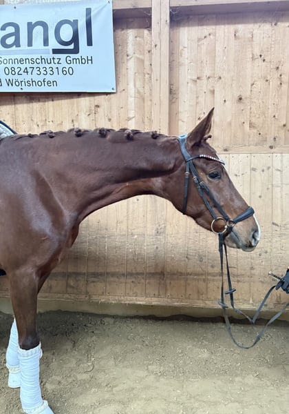 Zum Verkauf steht eine bildschöne Dressurstute, geboren 2022, in der auffälligen Farbe Dunkelfuchs mit vier weißen Füßen. Sie überzeugt durch ihren edlen Auftritt, klare Linien und eine sehr harmonische Gesamterscheinung. Diese junge Stute stammt ab von Bonderas (Bonds – Benicio – Bellissimo M), einem Vererber, der für Rittigkeit, Ausdruck und moderne Dressurpferde bekannt ist. Mütterlicherseits führt sie bestes Blut über Belanta (Belantis – Benetton Dream – Bretano II), eine der erfolgreichsten Dressurvererberlinien der letzten Jahre. Damit vereint sie Leistungsbereitschaft, Bewegungsqualität und einen ausgezeichneten Charakter. Die Stute zeigt sich altersgemäß entwickelt, mit drei guten Grundgangarten, viel Takt und natürlicher Balance. Besonders hervorzuheben sind ihre aktive Hinterhand und die bergauf gerichtete Silhouette. Sie ist aufmerksam, menschenbezogen und unkompliziert im Umgang – ideale Voraussetzungen für eine erfolgreiche Zukunft im Dressursport. Sie kennt Halle, Reitplatz, erste Stangenarbeit unter dem Reiter, Freispringen und kleine Runden im Gelände. Sitzbequem und fein an den Hilfen macht diese Stute jeden Tag aufs Neue Spaß. Dank ihrer hochwertigen Abstammung und ihres vielversprechenden Bewegungspotenzials ist sie sowohl als Sportpartner für ambitionierte Reiter als auch als interessante Zuchtstute bestens geeignet. Ein Pferd für Liebhaber moderner Dressurpferde mit Perspektive. Das Pferd steht in 82256 Fürstenfeldbruck und kann jederzeit Probegeritten werden. Barbie ist vorne beschlagen, entwurmt und durchgeimpft.