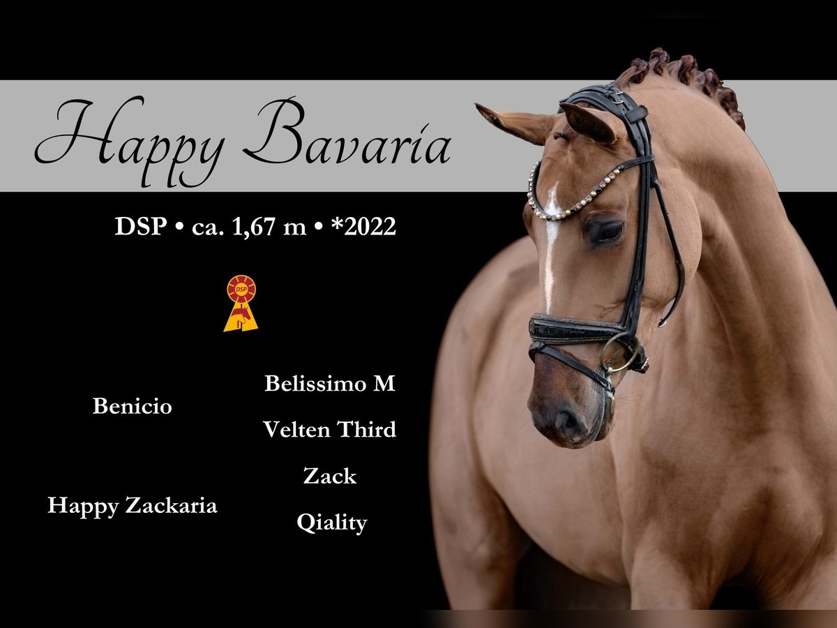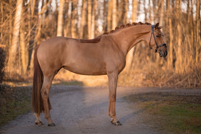 Dear Interested Parties, To arrange a viewing or trial ride, please send me a WhatsApp message. For further questions, I am available via WhatsApp during the day, and you can reach me best by phone between 4 p.m. and 7 p.m. I look forward to hearing from you. www.angelina-devittorio.de ⭐️Happy Bavaria⭐️ Age: 4 years (2022) Height: approximately 16.1 hh Lineage: Benicio x Zack Training level: Vice State Champion 2025 X-ray: Good radiographs available Up for sale is an outstanding young dressage horse with exceptional quality. Happy impresses with her excellent fundamental qualities across all three gaits! She has already demonstrated her talent at competitions, becoming Bavarian Vice State Champion and earning a nomination for the Bundeschampionat 2025. Despite her young age, this stunning mare already shows very calm and focused behavior. With remarkable expression and an excellent work attitude, she exhibits impressive learning ability. A promising dressage prospect that aims to excel and has the potential for the grand arena. Very manageable in handling as well. Suitable for amateurs; naturally, some experience with young horses is recommended due to her age. An absolute dream horse with outstanding quality and the potential for top-level competition. She also has very good radiographs. As a three-year-old, the mare occasionally head-butted when eating concentrates. After the feed trough was removed, she no longer showed this behavior. We want to be open and honest about this, which is why she is offered at a very favorable price. ⚜️Phone: 0171-3438949 ⚜️a.devittorio@web.de ⚜️https://www.ehorses.de/angelinadevittorio Facebook and Instagram: Angelina De Vittorio