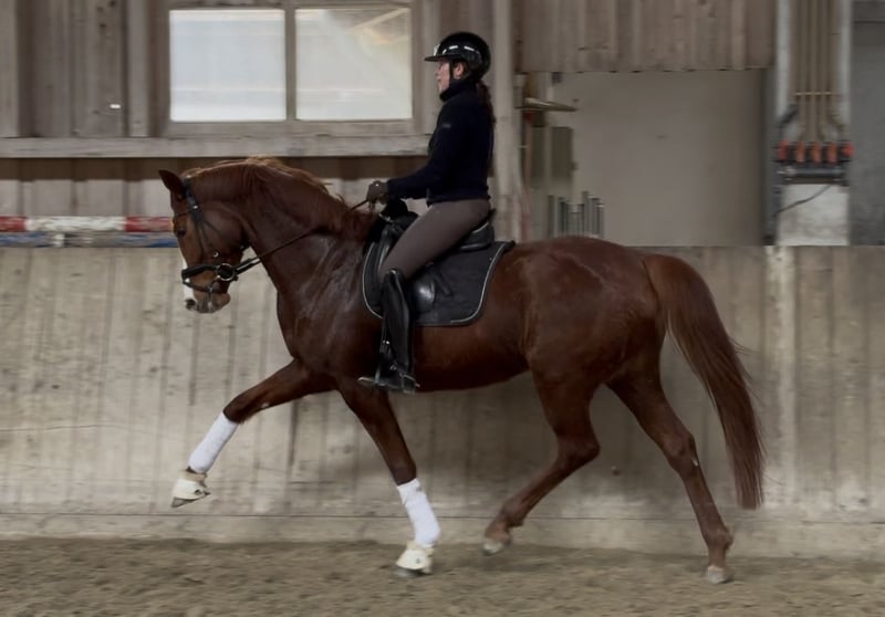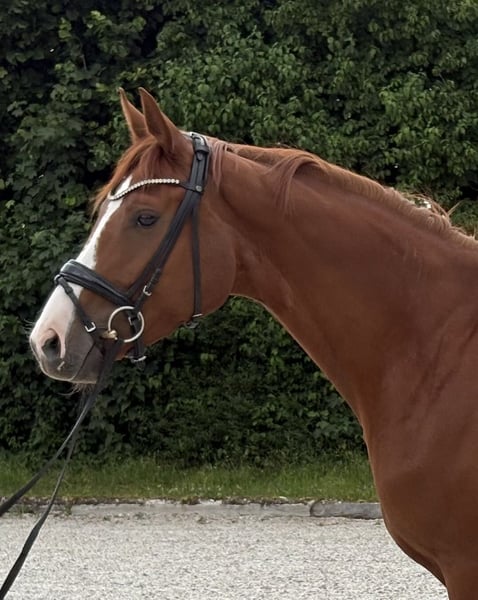 For sale is an exceptionally typy and expressive 4-year-old chestnut mare, approximately 16.9 hands high. This impressive young mare captivates with her elegant appearance in a stallion-like conformation, combined with outstanding movement quality, a beautiful uphill tendency, and a particularly modern and impressive front-leg mechanics. In daily training, she consistently demonstrates high motivation, eagerness to learn, diligence, and focus. Her positive and attentive character is especially noteworthy – she shows interest, willingness to learn, and a friendly attitude towards humans, making her a true pleasure to handle every day. Under saddle, she exhibits excellent rideability, providing the rider with a consistently soft and refined feel in the hand. She is easy to ride through the back and impresses with very steady contact. Additionally, she is extremely comfortable in the saddle, carrying the rider with great balance and body awareness, which results in a particularly harmonious riding experience. Currently, this promising young mare is performing confidently at a solid A-level in dressage and possesses all the prerequisites to develop into a highly successful dressage horse. With her top-class movement potential, striking presence, and excellent interior qualities, she combines everything one wishes for a successful future in dressage. Good X-ray images, including the back.