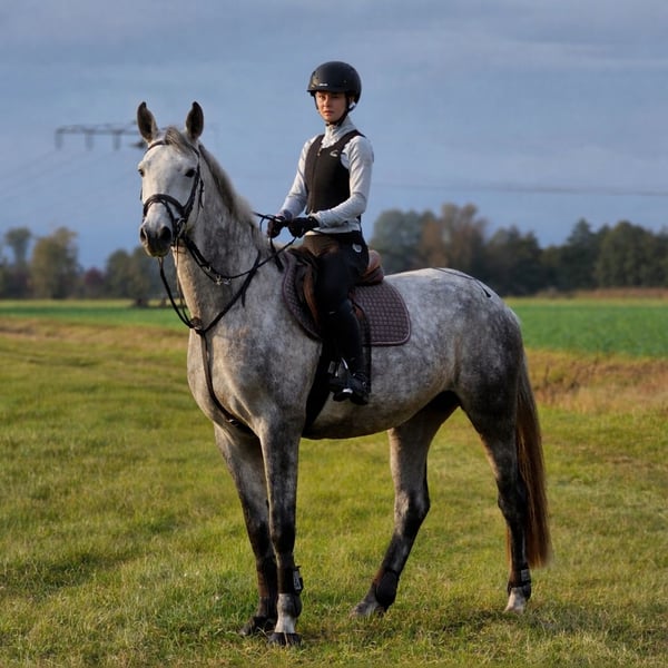 Celda is een echte eye-catcher. Deze knappe 5-jarige grijze merrie is ongeveer 1,70 m groot en overtuigt door haar evenwichtige karakter. In omgang is ze zeer braaf en makkelijk in de omgang. Zadelmaker en dierenarts ondervinden geen enkele problemen (ze wordt naakt hoefbevijling gereden). Onder het zadel is ze moedig en onbevreesd, zowel alleen als in een groepje op buitenrit te brengen. Wij zien haar geschiktheid vooral in de hogere vrijetijdssport. Vanwege haar leeftijd en opleidingsniveau is ze echter (nog) geen beginnerspaard en heeft ze verdere begeleiding nodig. Actuele röntgenfoto's zijn aanwezig. Graag kunnen we haar na telefonische afspraak bekijken. Voor het proefrijden wordt €30 gevraagd, dat bij de aankoop verrekend wordt.