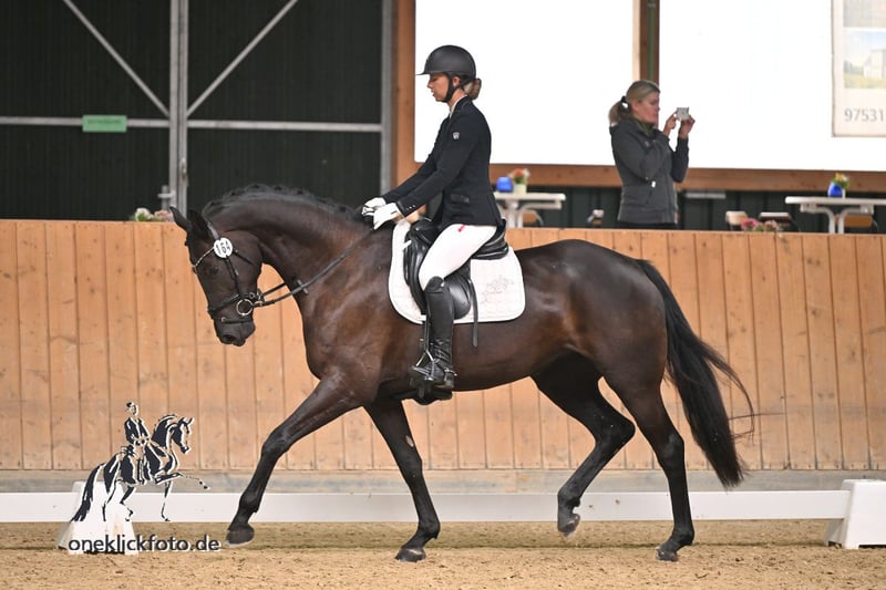 Questa intelligente cavalla di 5 anni sta cercando una nuova casa. È con noi da quando aveva 6 mesi ed è stata addestrata dolcemente all'età di 4 anni. Nelle sue prime esposizioni ha già dimostrato di essere estremamente impavida e tranquilla, ma di possedere ancora ottime andature di base, tanto che ha già vinto un test per giovani cavalli da monta. Ora è sicura di sé nel canter esterno e ha già acquisito la padronanza dei cambi semplici. Anche i cambi al volo non sono più un concetto sconosciuto. Abbiamo anche iniziato a praticare i movimenti laterali, ma solo di recente. È molto facile da cavalcare (anche per i giovani della scuderia) e si comporta altrettanto bene in campo. Un cavallo sempre divertente e che vuole piacere. Sarò lieta di rispondere ad altre domande telefonando al numero 0160 1662003.