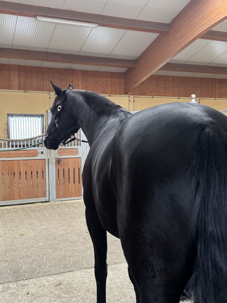 Esta inteligente yegua de 5 años busca un nuevo hogar. Ha estado con nosotros desde que tenía 6 meses y fue domada suavemente a la edad de 4 años. Ya ha demostrado en sus primeros shows que es extremadamente intrépida y tranquila, pero todavía tiene grandes aires básicos por lo que ya ha ganado una prueba para caballos jóvenes de equitación. Ahora tiene confianza en el galope exterior y ya domina los cambios sencillos. Incluso los cambios volantes ya no le resultan extraños. También hemos empezado a practicar los movimientos laterales, pero sólo recientemente. Es muy fácil de montar (incluso para los jóvenes de la cuadra) y se comporta igual de bien en el campo. Un caballo que siempre es divertido y quiere agradar. Estaré encantada de responder a cualquier pregunta por teléfono en el 0160 1662003.