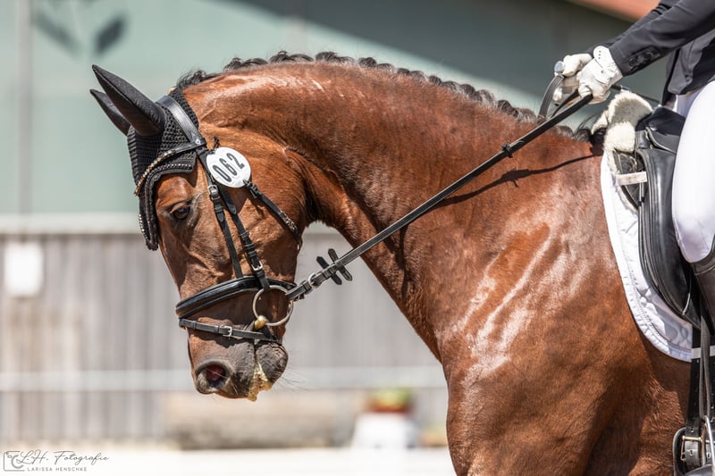 For sale: Elegant dark chestnut mare – German sport horse We are offering a beautiful German sport horse mare, born in 2020. Standing at an impressive 16.1 hh, she combines strength, elegance, and expressiveness. Our homebred mare, Tonia BL, is available – an exceptionally talented and striking young mare with great potential for upper-level dressage. Descended from Fürst Nymphenburg x Topas (son of the legendary Totilas), she embodies excellent rideability, a balanced temperament, and three above-average basic gaits in a modern, athletic type. This elegant chestnut mare impresses with lightness of movement, eagerness to learn, and expressiveness. Tonia has successfully competed in dressage horse tests of class A and, in her first L-level dressage young horse test—without extensive specific preparation—achieved an outstanding score of 7.22. She consistently shows motivation and focus during training. She already masters flying changes, shoulder-in, and volte exercises confidently, and traversals in trot and canter come easily to her. But Tonia is not only at home in the dressage arena: She demonstrates talent and awareness over fences, combined with a quick, alert front leg and a lot of enthusiasm for work. During a basic jumping test, she performed confidently and with great composure—truly a versatile partner for any rider. In daily handling, Tonia is straightforward, well-behaved, and very people-oriented. She is easy to ride, honest in character, and well-suited for ambitious amateur riders. Another highlight: Tonia has already foaled a healthy, typey foal—a further testament to her quality, also as a future broodmare. A mare that impresses in every way—for riders seeking lightness, potential, and charm in one horse. 📍 Location: Ausbildungsstall Berner-Leis, Aurach (Middle Franconia) 📞 Videos & more information: 0155 6014 9005