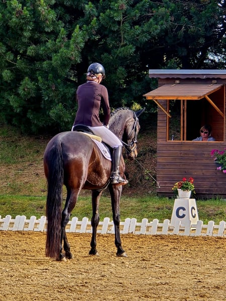 For sale is a 2019-born sport horse mare. She has a unilateral vocal cord paralysis, which causes a slight roar, and tends to develop asthma. Both conditions cause her minimal issues and she does not require any medication. This year, she competed up to class L in competitions. However, intensive training over a longer period is challenging for her. She can be ridden normally for leisure, and hacking out or light dressage work are very enjoyable for her. She has a wonderful temperament and remains very calm despite her age. I am looking for a leisure rider who enjoys hacking and values dressage work at A/L level. She is not suitable for children or inexperienced riders. Currently, she is shod in front and lives in a mixed herd. She is not dominant towards other horses. With some patience, she loads well. A dressage saddle tailored to her needs can also be purchased. Please feel free to contact me via WhatsApp if you have any questions.