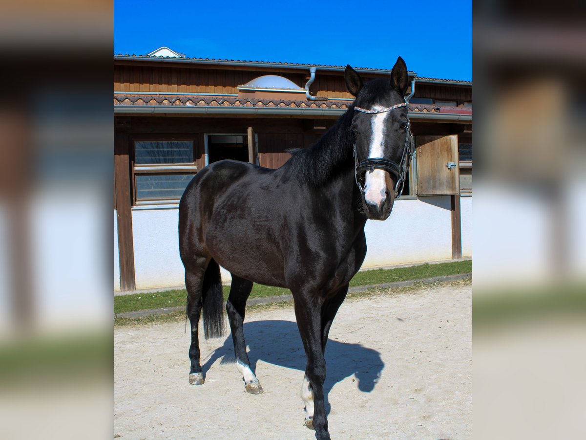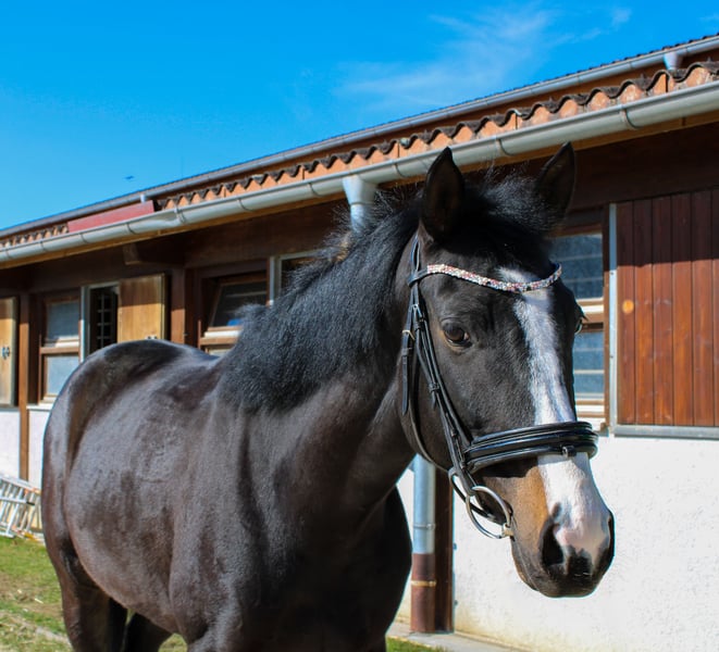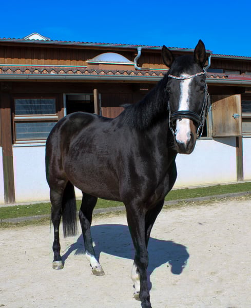 For our sweet, jet-black mare Schnelle Socke (Silvery Moon xx x Epikur), we are looking for a loving home with an empathetic rider who appreciates her delicate nature. About Schnelle Socke This mare, born in 2019, is currently being gently and horse-friendly backed. From the very beginning, she has shown herself to be kind, attentive, and eager to learn – a promising foundation for her further development. At the moment, she is in the process of building muscle and finding her balance, but her quality is already noticeable. She possesses three clear, elastic basic gaits, a natural lightness in her movement, and a pleasant temperament. Pedigree – Power and Elegance Combined Her sire, the Thoroughbred Silvery Moon xx, impressed not only with his extraordinary appearance but also with his athletic toughness, intelligence, and unwavering fighting spirit – traits that he consistently passes on to his offspring. Her dam's sire Epikur, a proven sire in dressage, brings rideability, ability to collect, and a pronounced sensitivity. This thoughtful pairing gives Schnelle Socke a rare combination of elegance, speed, and intelligent calmness. Character and Suitability Schnelle Socke is a sensitive, delicate mare who wants to build a trusting relationship with her rider. She works attentively, responds finely to aids, and is always motivated. Her gentleness and willingness to learn make her an ideal partner for a rider who nurtures her talents with patience and sensitivity. Who is Schnelle Socke Suitable For? She is the perfect choice for empathetic riders who enjoy a fine, partnership-based communication with their horse. Whether in dressage, versatile training, or as an elegant leisure partner – she has the potential to develop into a true heart horse. If you are looking for a talented, sensitive mare with potential, we look forward to meeting you and Schnelle Socke! For more information, videos, and viewing appointments, please feel free to inquire.
