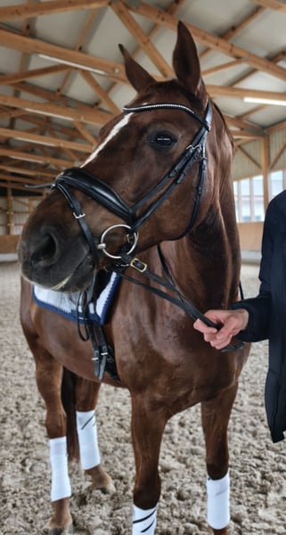 Zum Verkauf steht eine 8-jährige, wunderschöne und leichtfüßige DSP Staatsprämienstute mit einem Herz aus Gold! Diese außergewöhnlich schöne Stute beeindruckt nicht nur durch ihre wunderschöne Erscheinung, sondern auch durch ihr Talent und Qualität. Mit ihrem nervenstarken und unkomplizierten Wesen, ihrem stets ehrlichen Charakter und ihrem großen Willen zu gefallen ist sie ein echtes Traumpferd, das sowohl in der täglichen Arbeit als auch im Umgang begeistert. Sie ist mit drei TOP Grundgangarten ausgestattet, welche in Dressurpferdeprüfungen bereits mit hohen Noten belohnt wurden. Sie hat bereits Dressurpferde A gewonnen und konnte sich bereits mehrfach auf L Niveau vorne platzieren. Traversalen und Wechsel wurden in der täglichen Arbeit angefangen. Hier reift ein überragendes Nachwuchspferd mit hervorragender Perspektive für das große Viereck heran, welches bisher von Amateurinnen ausgebildet wurde. Aufgrund ihres liebevollen Charakters und einfachem Umgang eignet sie sich auch ideal für jeden Amateur sowie Kinder. Sie ist als aktuelles Turnierpferd fortgeschrieben und bereit zum losreiten. Aktuelle Röntgenbilder liegen vor – ohne Befund. (Werden bei ernsthaftem Interesse gerne weitergeleitet) Bei Bedarf wird der passende Zubehör auch mit verkauft. (Sattel, Trense, Kandare, etc.) Kontaktaufnahme gerne auch telefonisch oder per WhatsApp: 0151 28755752