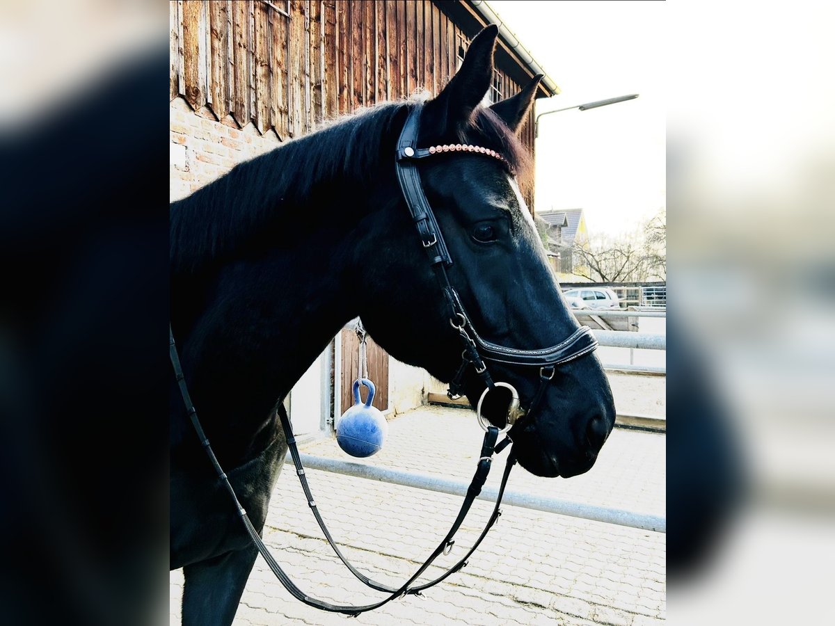 Beautiful 8-year-old elegant black mare – registered with the Bavarian Breeding Association – for sale. She produced a highly movement-oriented, premium Gold foal (Vitalis) at the age of four. The mare herself has multiple placings in A-Dressage and is already confidently competing in L-level tests. She happily and confidently jumps small fences under saddle. She has been gently backed and trained by us. Well-behaved in handling, sound and easy to load and shoe. The mare is being sold solely as a broodmare or leisure horse. *** For more information, please contact us only by phone at 0176/21305781! ***