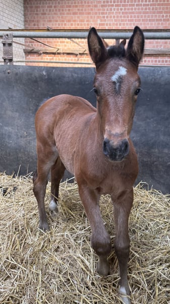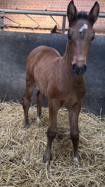 Typical filly with excellent pedigree – from private, personal breeding For sale is a beautiful bay filly, born on March 4th, 2026, from our own breeding program. This young lady impresses with her correct conformation, elegant appearance, and a lively, friendly expression. Her distinctive features include a lovely head with a small, fine blaze and white markings on her legs, giving her a very special look. She already shows a very trusting, human-oriented, and curious temperament. Raised appropriately in a herd, she is accustomed to daily handling and presents herself as attentive and balanced – ideal qualities for a successful career in sport or as a reliable partner. Pedigree: Grandofornio S x Casall x Contact Me → High-performance jumping bloodlines with great talent and rideability. Her full brother competes at 1.50 m. Details: - Mare - Bay with markings - Born March 4th, 2026 - Raised in a herd environment - Very gentle, affectionate, and open-minded She is expected to be weaned at the end of October, after which she could be moved. A genuine young horse for those who value quality, character, and pedigree. Private sale If interested, I look forward to your message. Viewings can be arranged at any time by appointment.